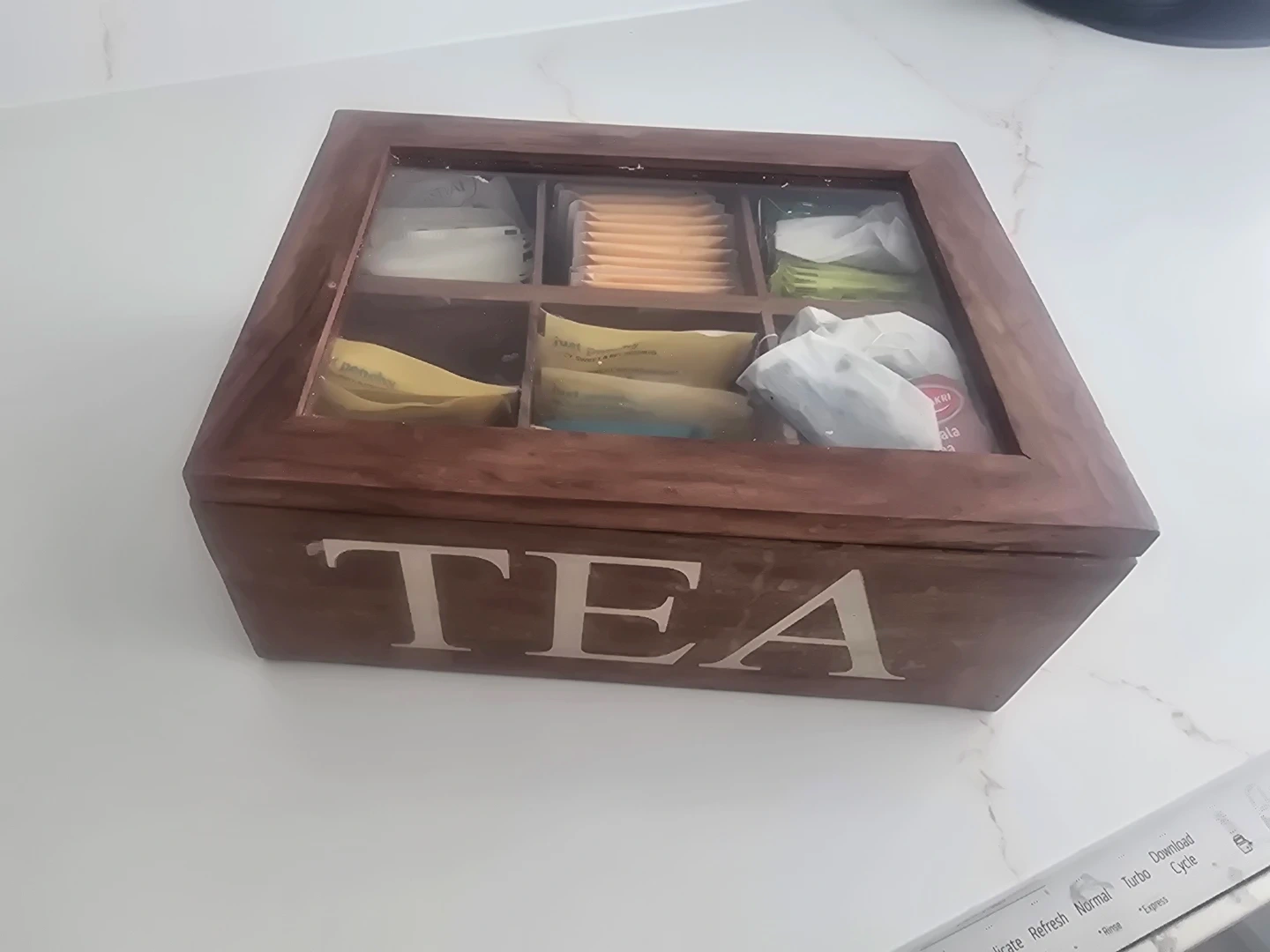This wooden tea box has a clear glass lid, perfect for organizing your tea bags. It features six compartments to keep different flavours separated. Its design makes it easy to see your selection at a glance!