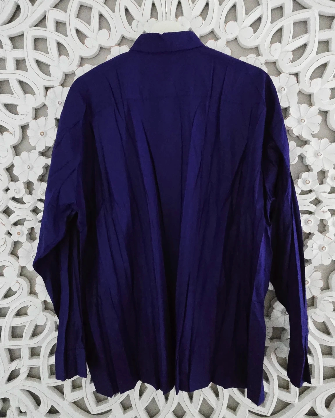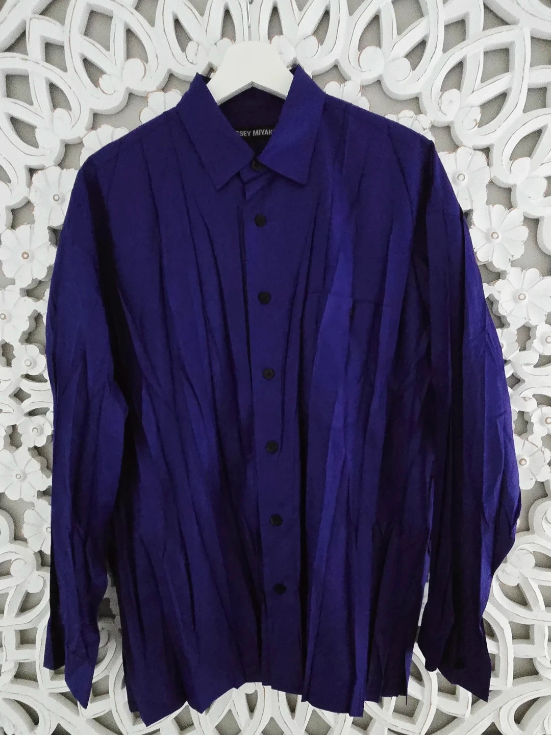 Issey Miyake button-down shirt! It's a beautiful purple colour and made in Japan. The size is 2, and it's made of polyester.