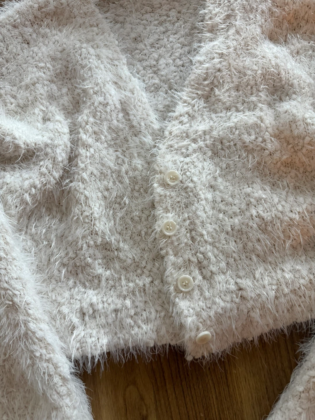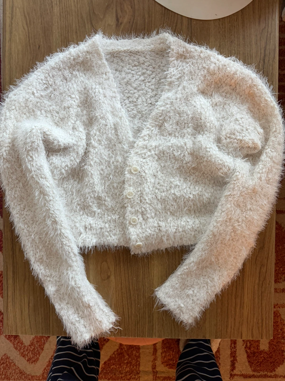 Cozy white cropped cardigan with a fuzzy texture. It features a V-neck and button closure. This sweater's soft material makes it comfy for cooler days.