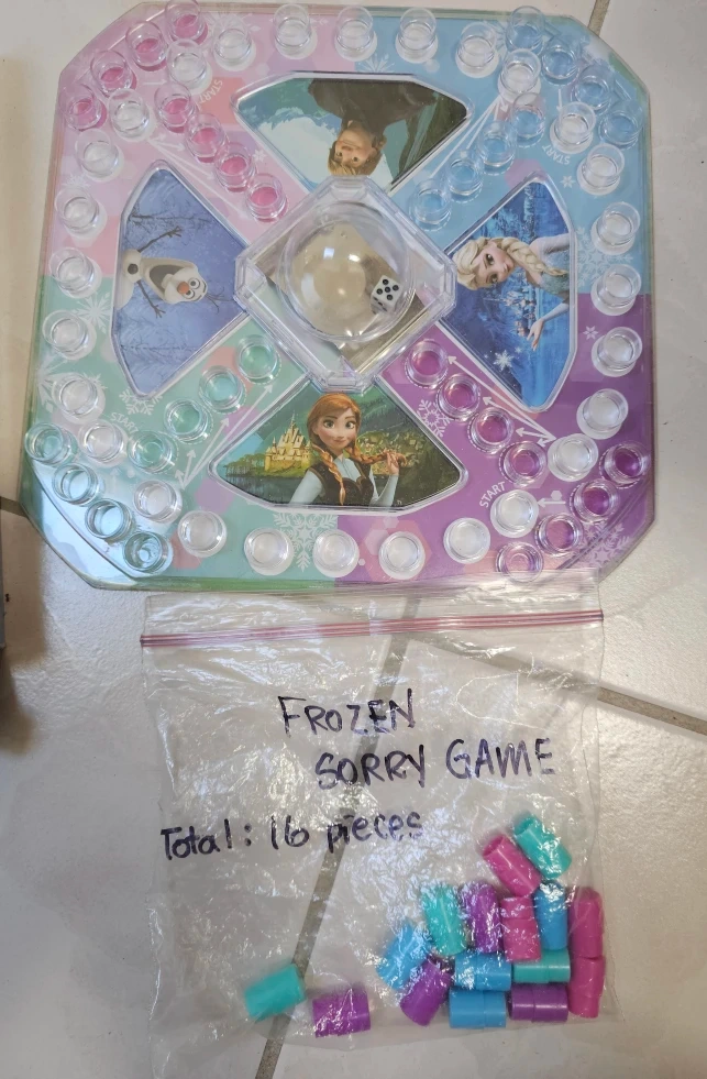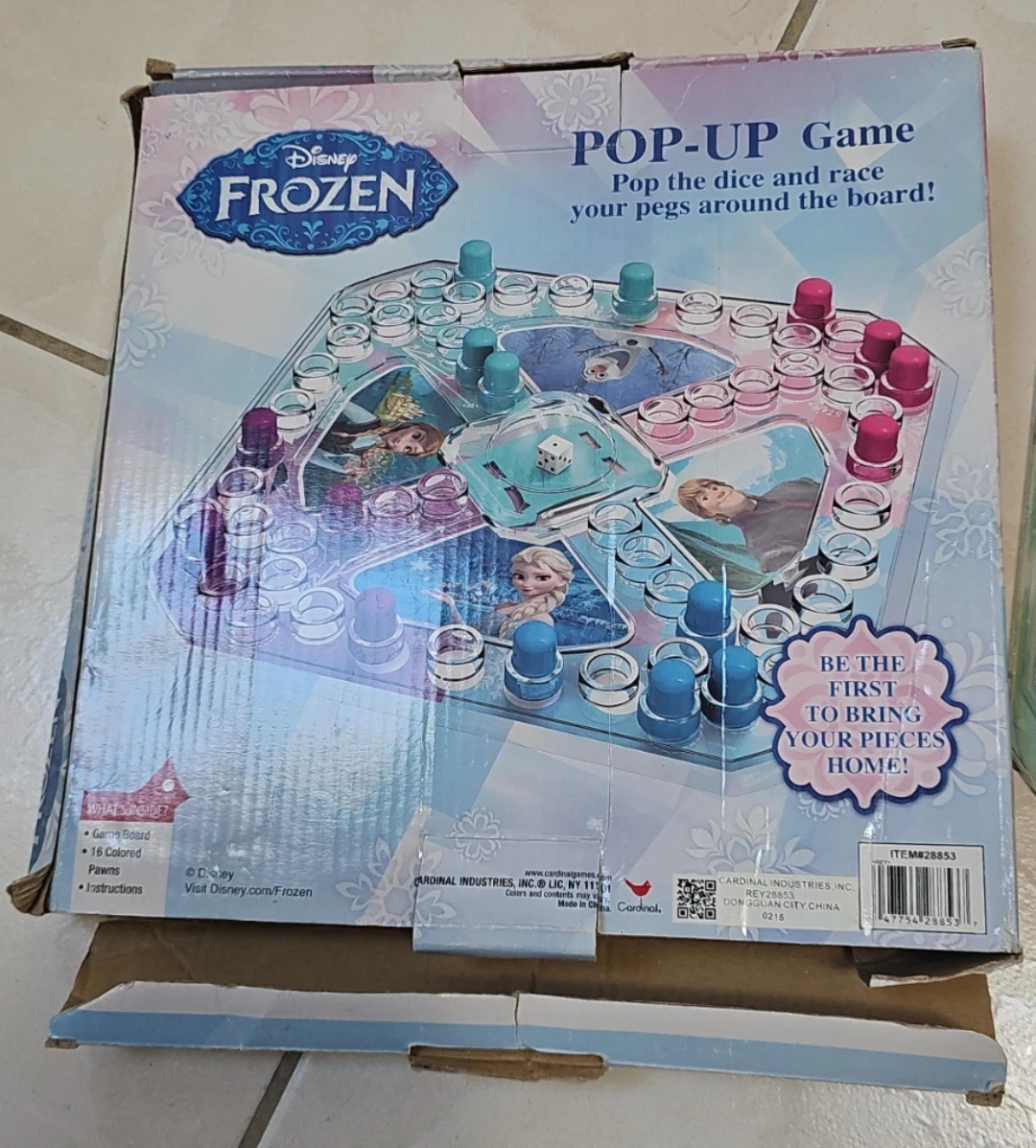 It's the Disney Frozen Pop-Up Game where you pop the dice and race your pegs around the board. Box is squished but the game board and pegs are like new.