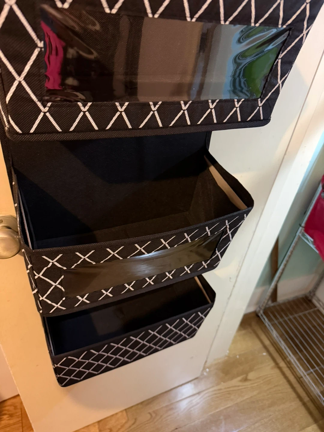 Black fabric over-the-door organizer featuring five clear-view pockets with a white geometric trim. It has two metal grommets at the top for hanging. Pockets are perfect for storing shoes, accessories, or small items. Great for keeping your space tidy!