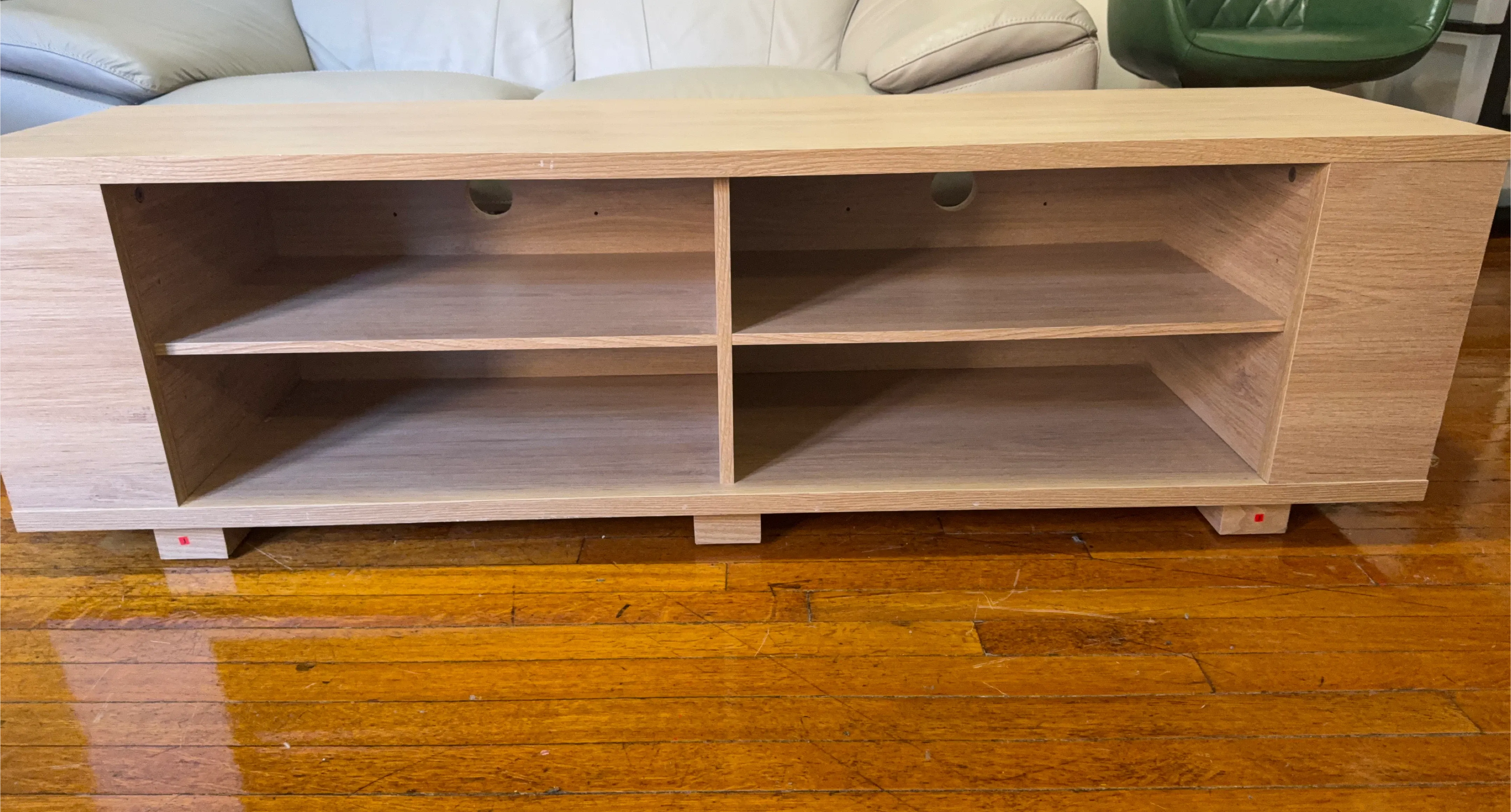 This TV stand features a light oak finish and multiple open shelves for media consoles or decor. It has two large open compartments on the bottom and two smaller compartments on top, with pre-drilled holes for cable management. The unit stands on short wooden legs with red marker dots.