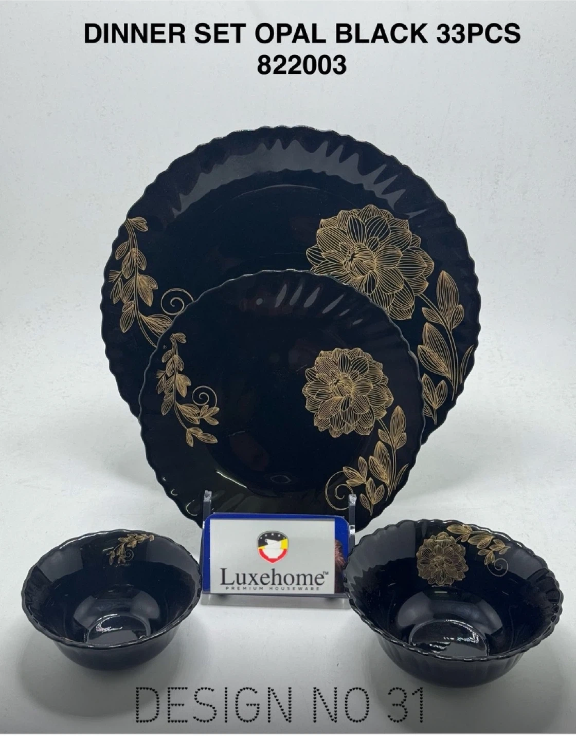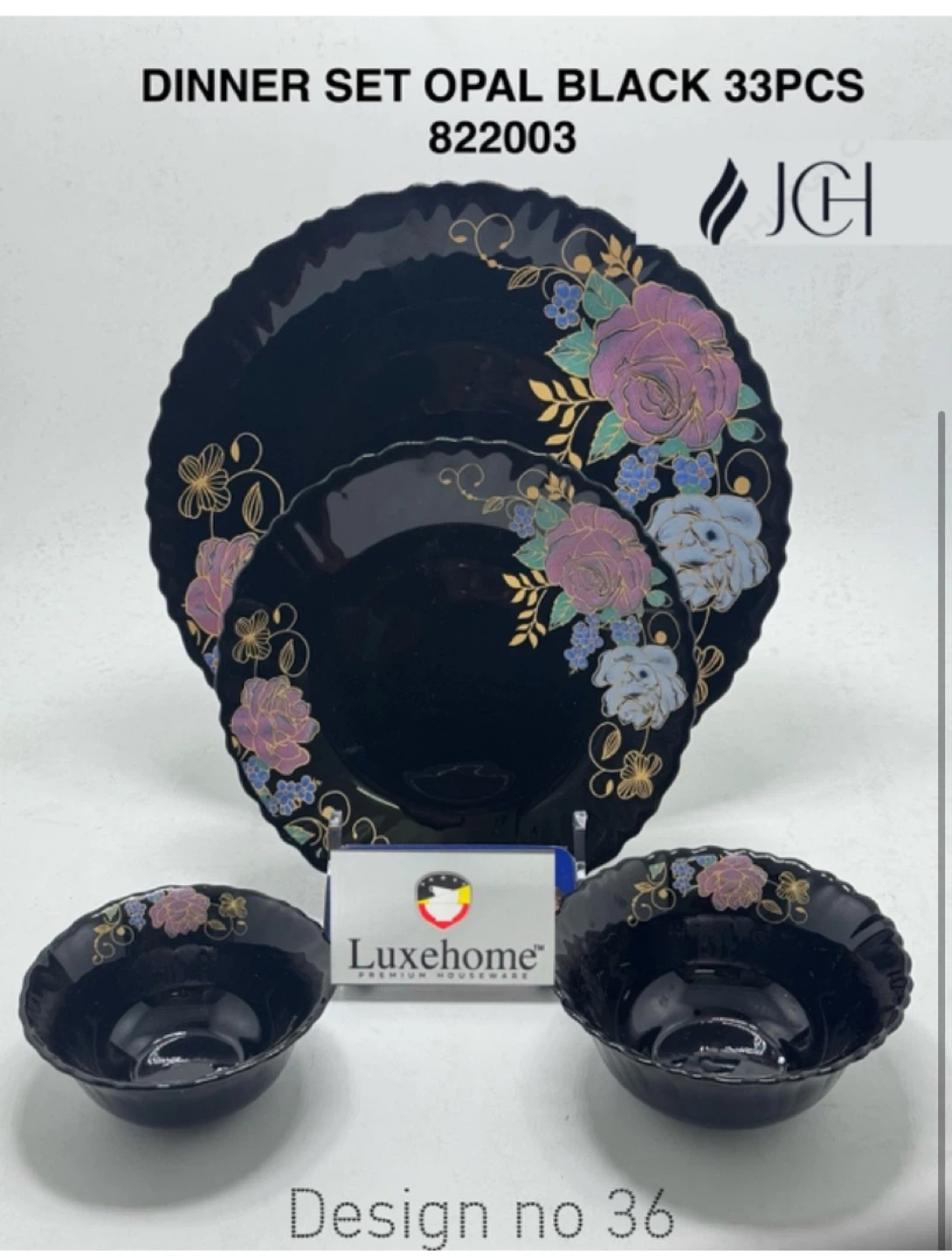 Selling a Luxehome dinner set in opal black, complete with 33 pieces! The set features a lovely floral design. Perfect for adding a touch of elegance to your dining experience