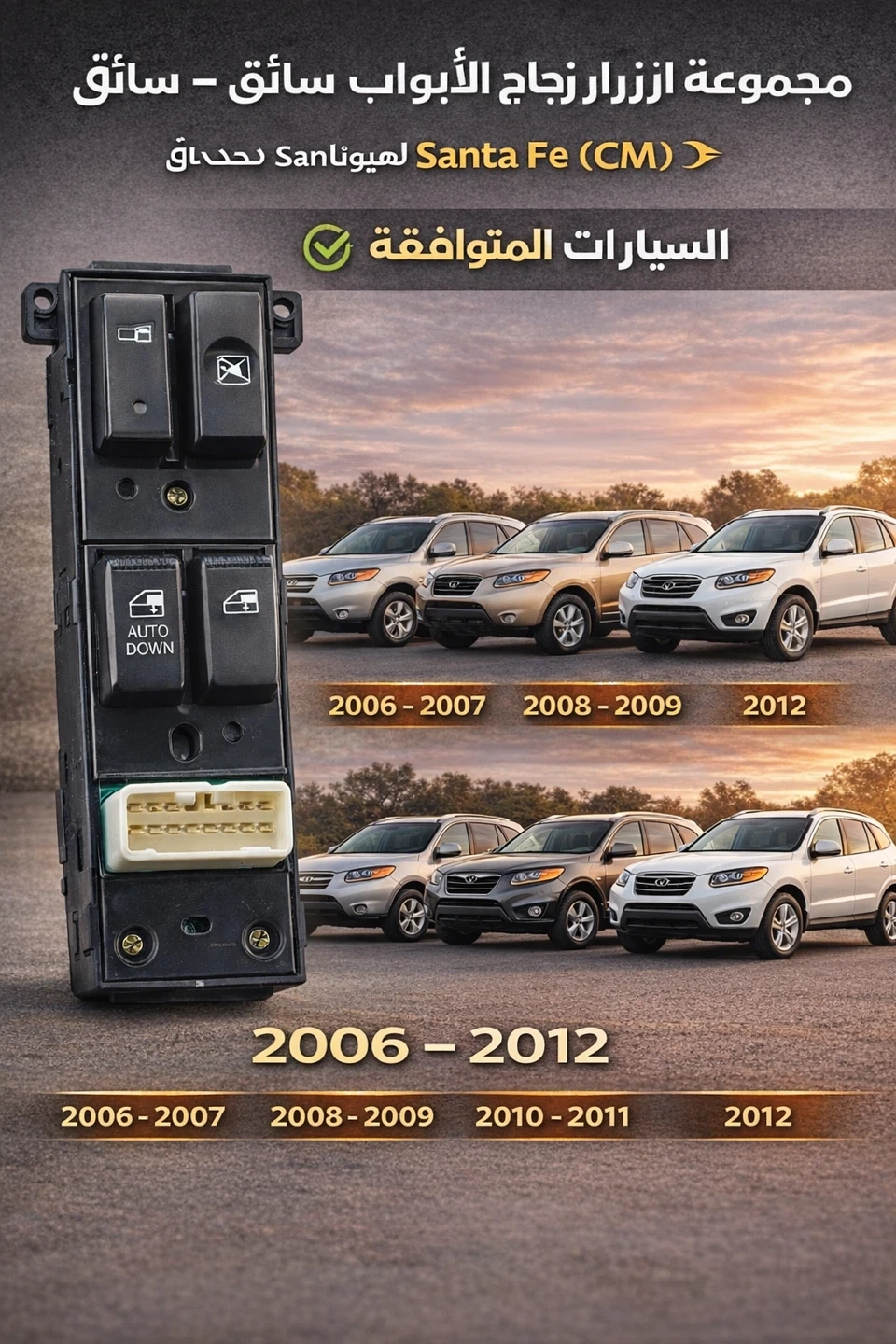 This is a power window switch assembly for a Hyundai Santa Fe. It's compatible with models from 2006 to 2012. The unit includes controls for driver and passenger windows, including an auto-down function.