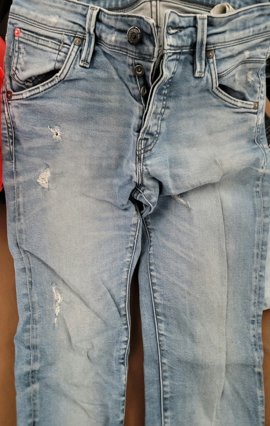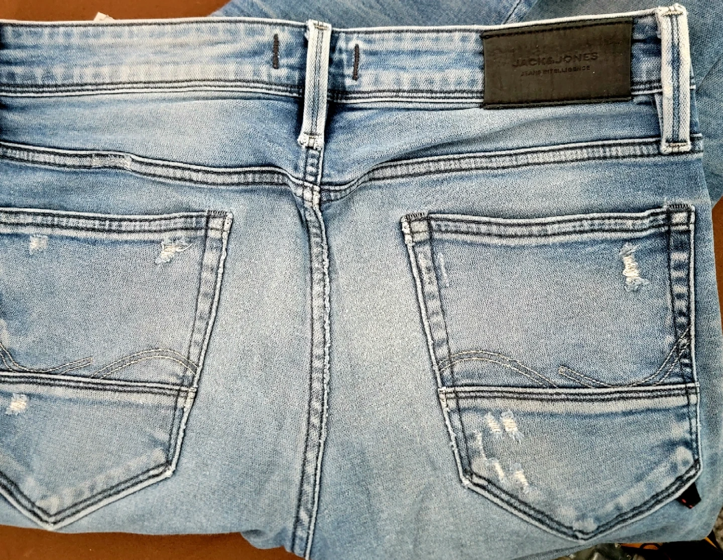 Jack & Jones men's light wash denim jeans. Slim fit style, Glenn model. Features distressed details and button fly. Size 33/34.