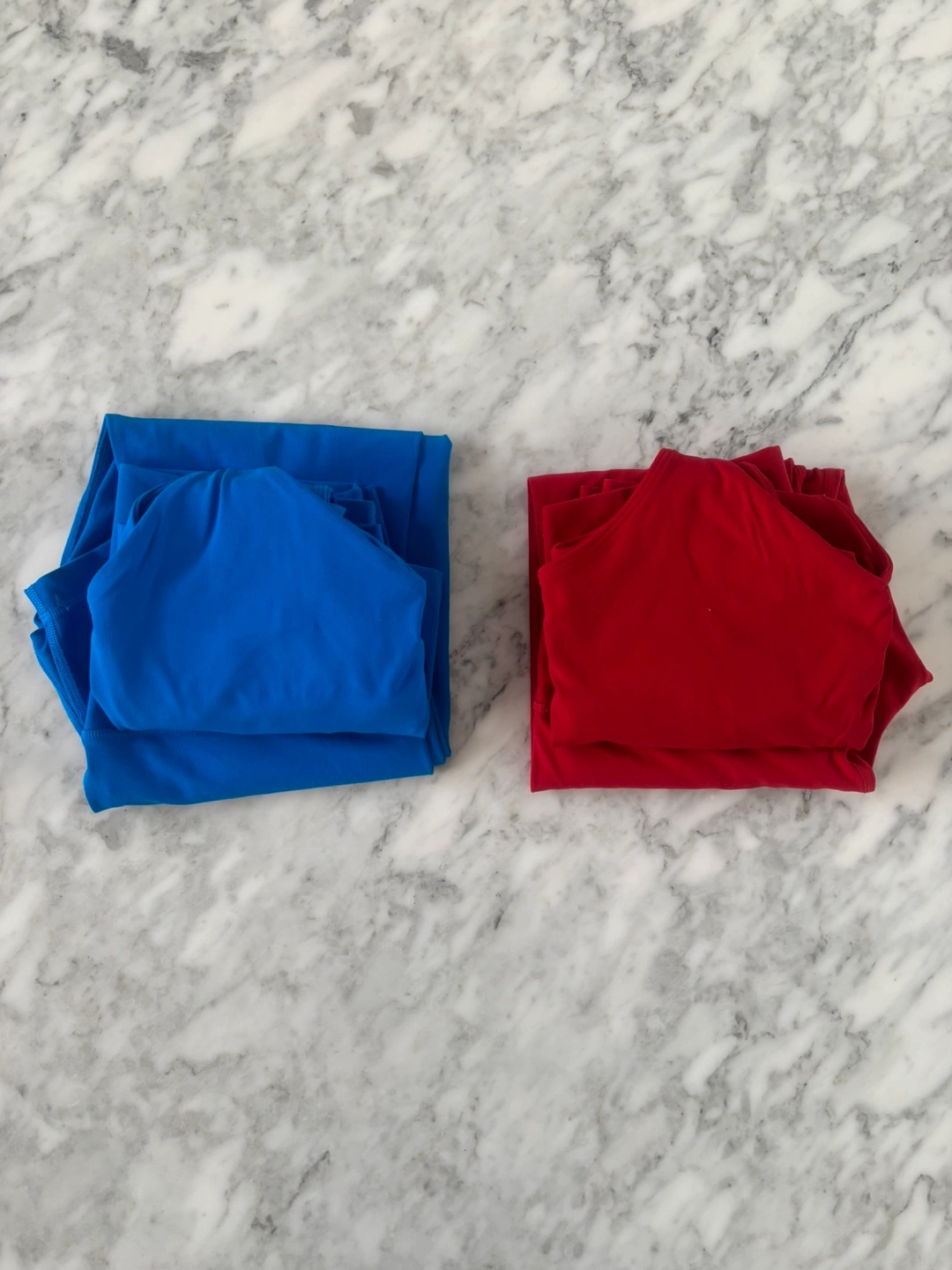 Two sets of matching cropped tank and 23 leggings. One set is bright blue, the other is red. Workout wear, athletic wear, comfortable material.