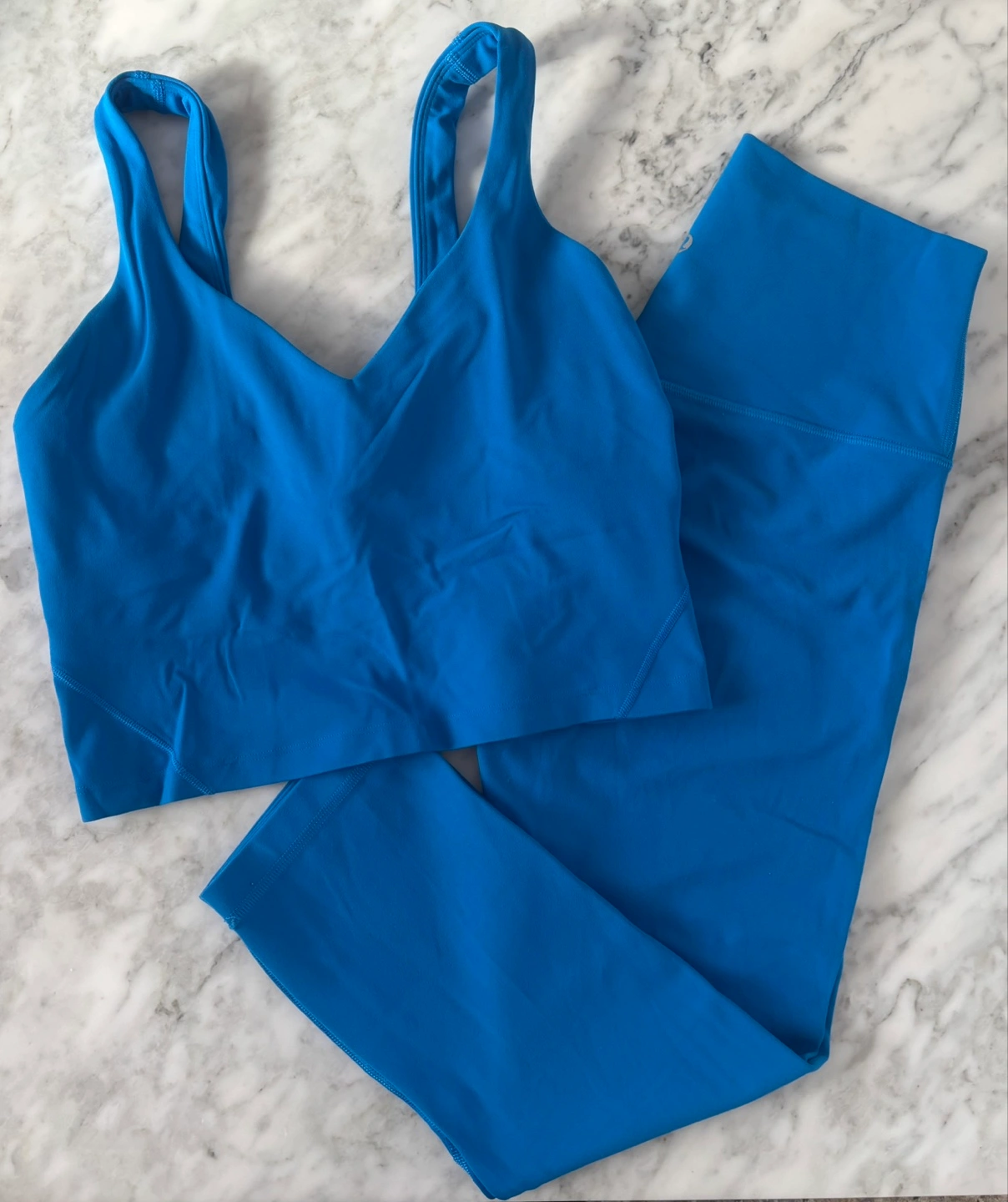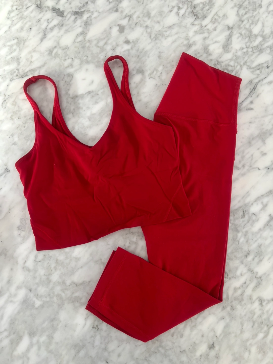 Two sets of matching cropped tank and 23 leggings. One set is bright blue, the other is red. Workout wear, athletic wear, comfortable material.