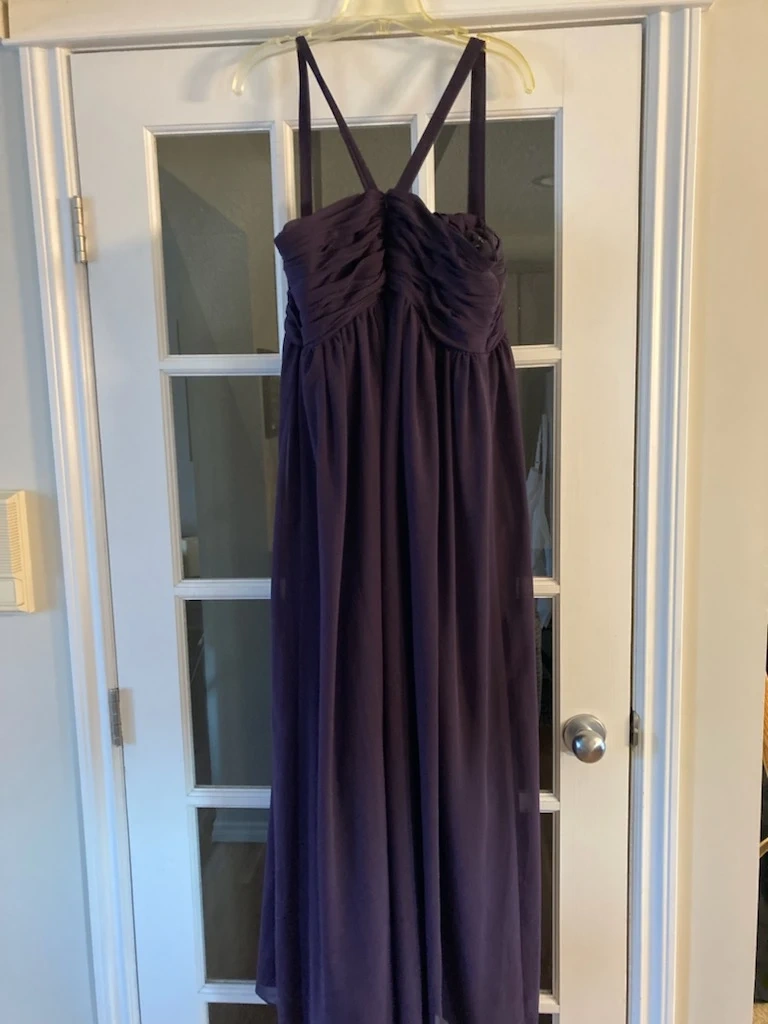 Taffeta gown. Was used as a bridesmaid dress therefore only worn once. The designer is Bill Levkoff. Size 22 but fits just a bit smaller.