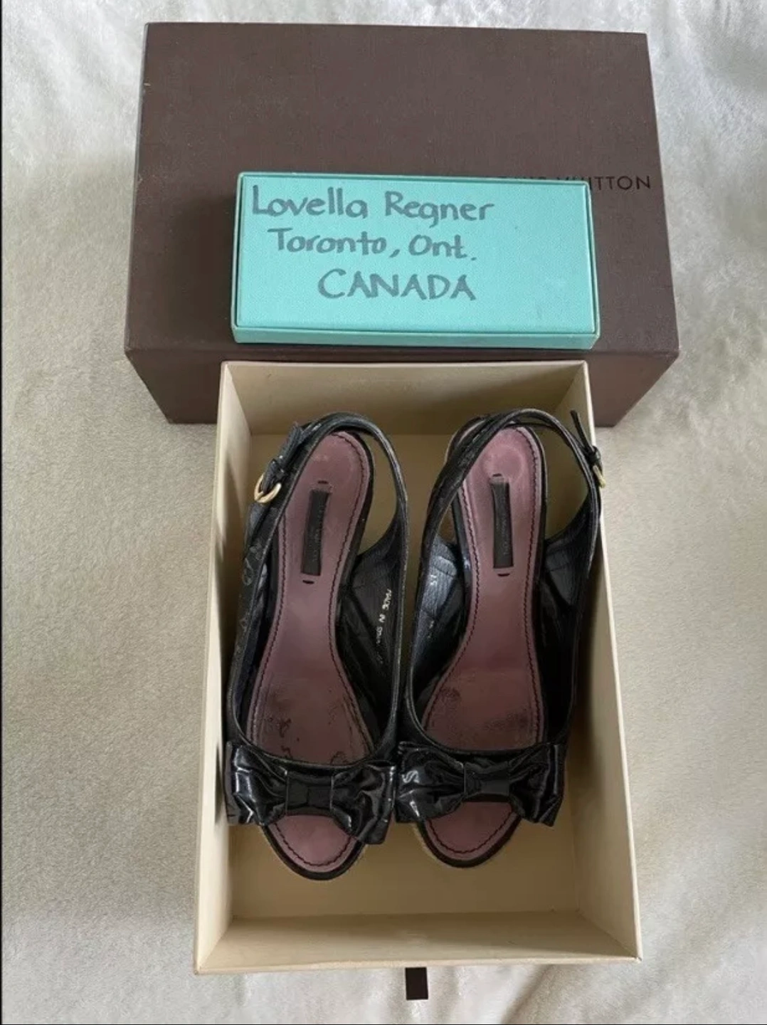 Fits 7.5 about 9 inches feet size. This is a black Idylle monogram wedge sandals with a bow. They come with a Louis Vuitton box. The sandals are in good condition. They show signs of wear on the wedge but no major damage.