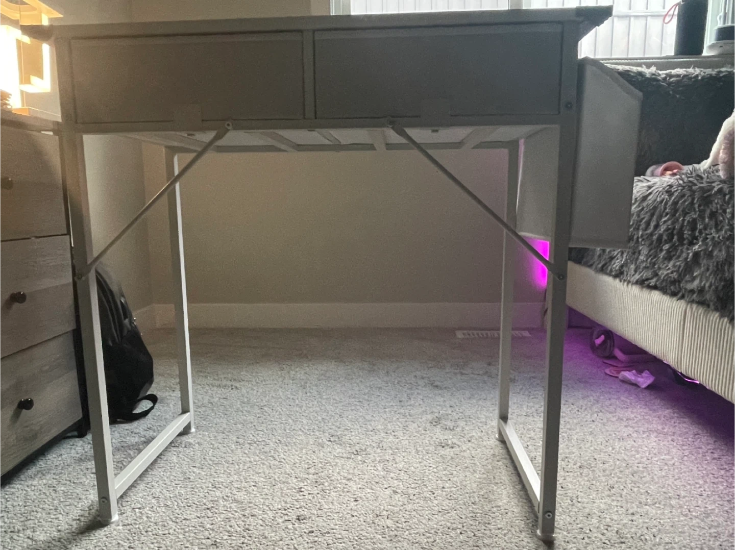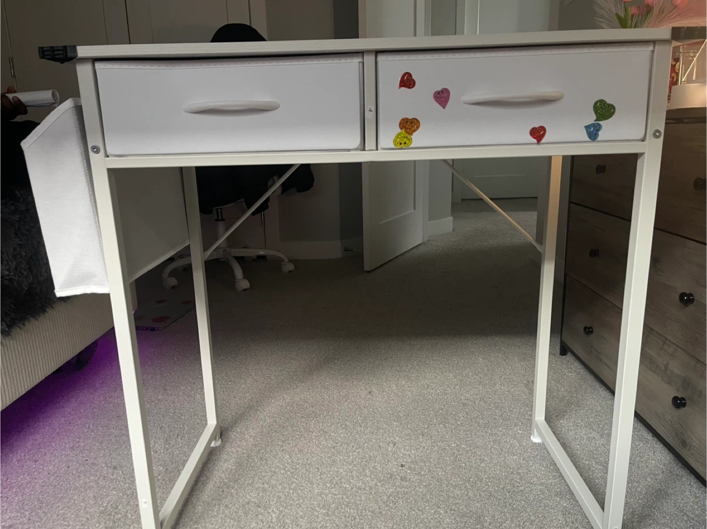White metal frame desk featuring two fabric drawers with handles. The drawers are lined with grey fabric. It's a compact desk perfect for small spaces.