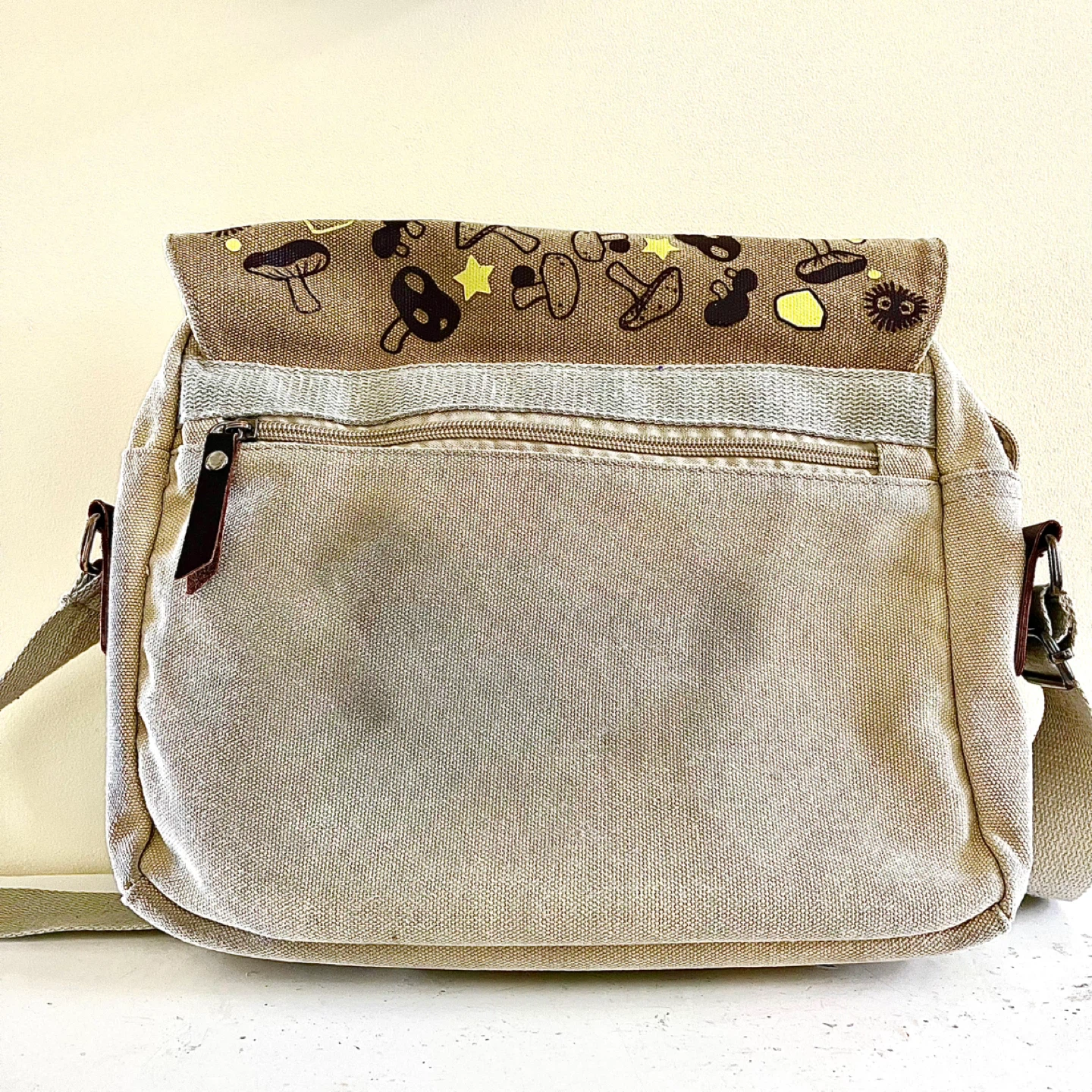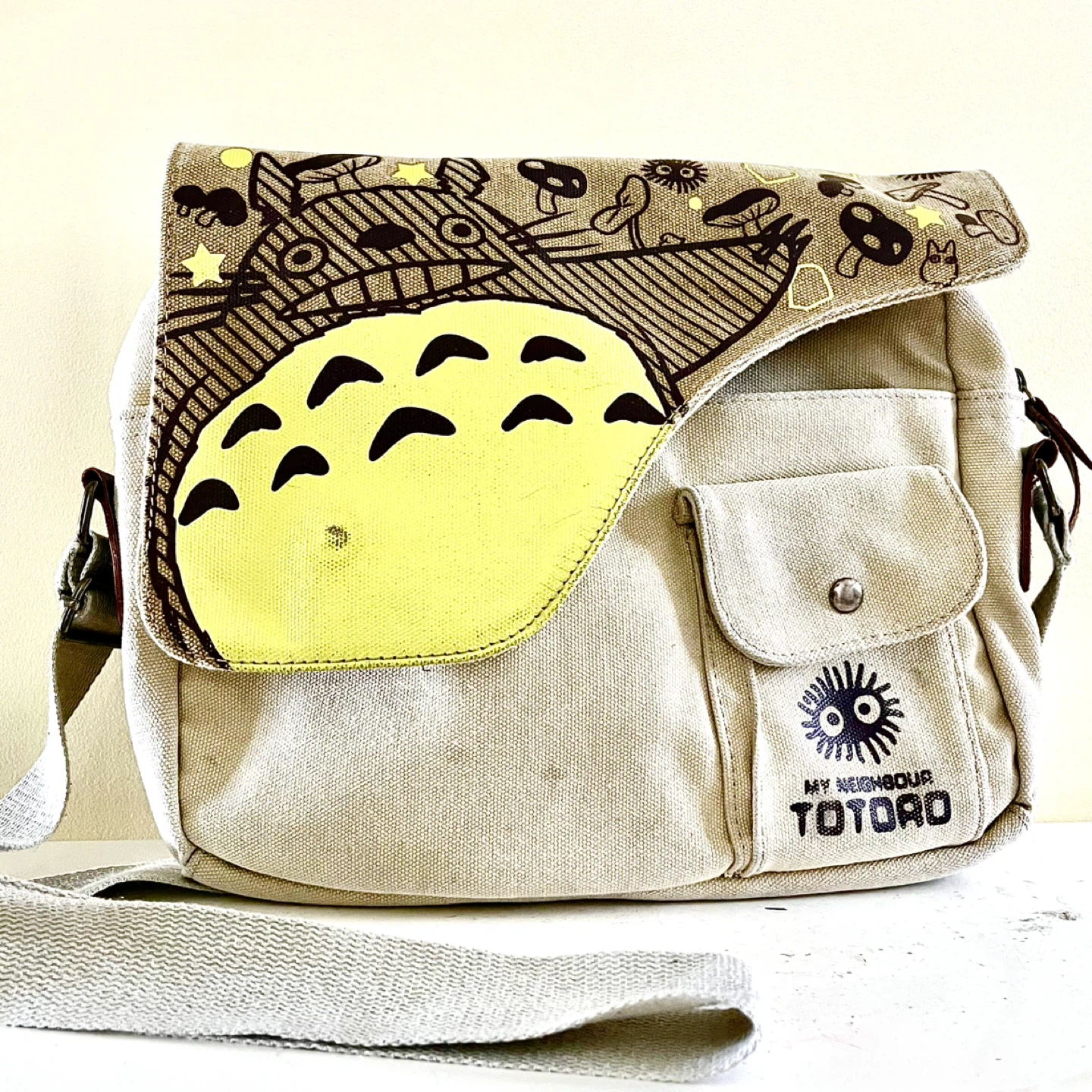 Super cute, used, Anime My Neighbor Totoro canvas messenger bag, perfect for carrying your essentials in style! Although it's in used condition, it still has plenty of life left. All zippers, snaps and seams in good shape. Measures 12”w x 10”h x 2”d.