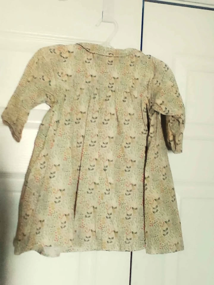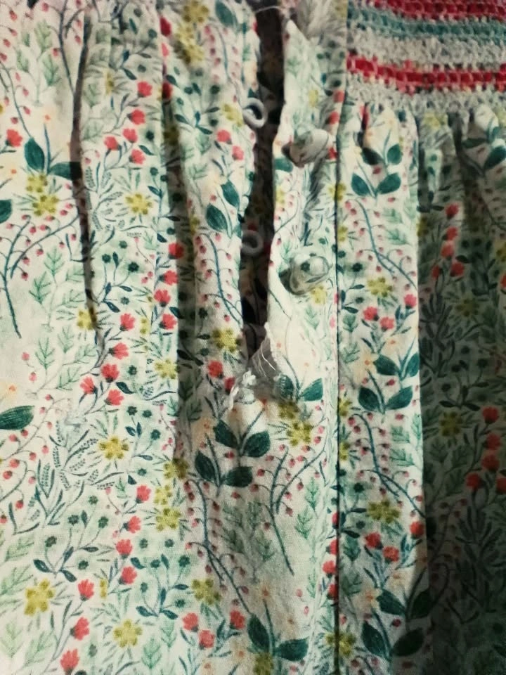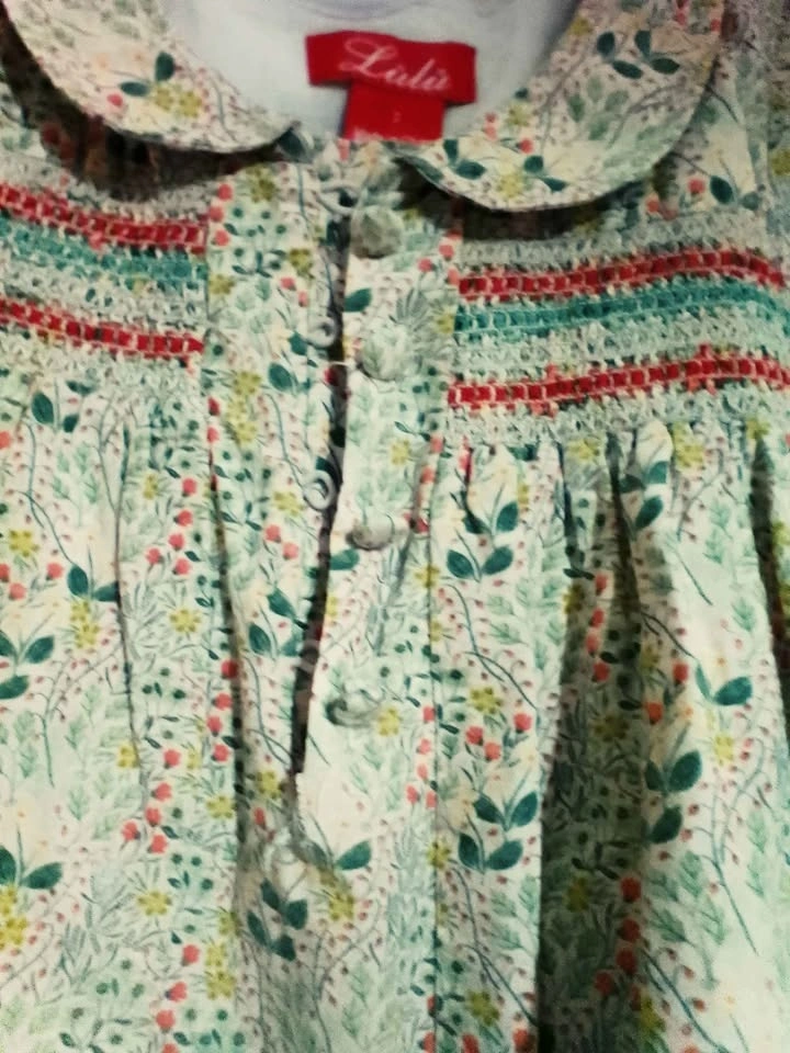Sweet Lulu toddler dress. Size 2. Has pretty floral print all over. Smocking detail on front with red and light blue colors. 3/4 sleeves. Has slight tear beneath the buttons.