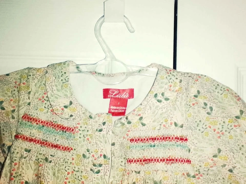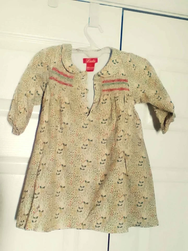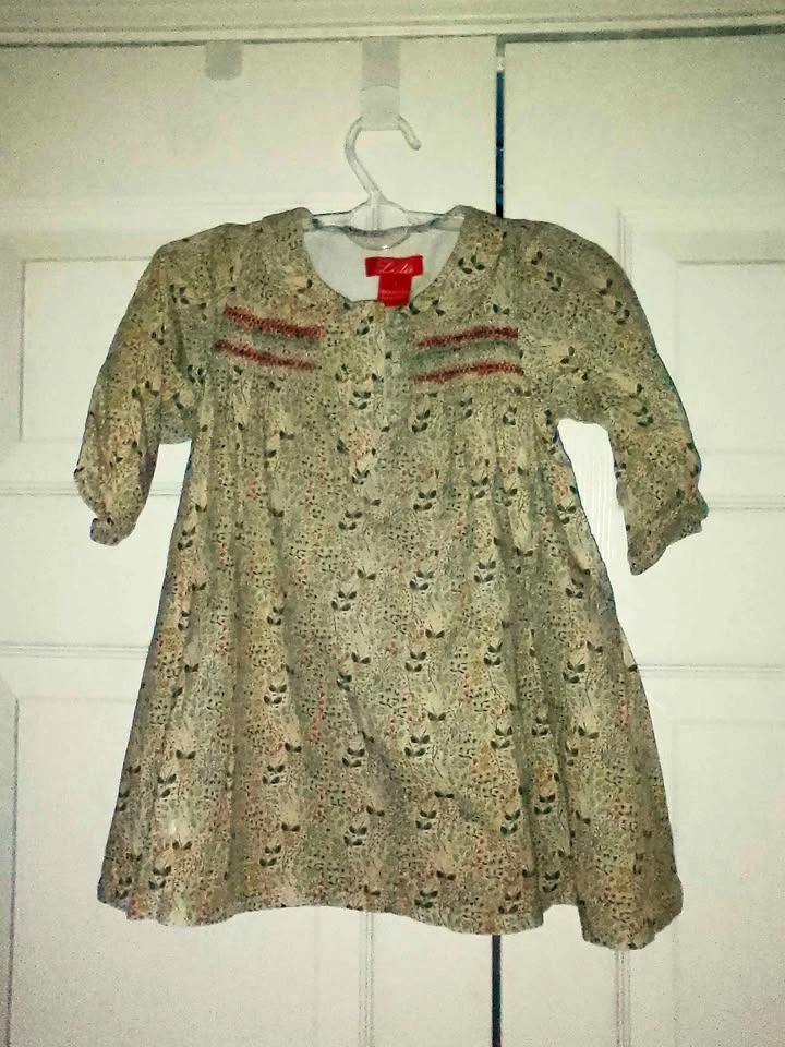 Sweet Lulu toddler dress. Size 2. Has pretty floral print all over. Smocking detail on front with red and light blue colors. 3/4 sleeves. Has slight tear beneath the buttons.