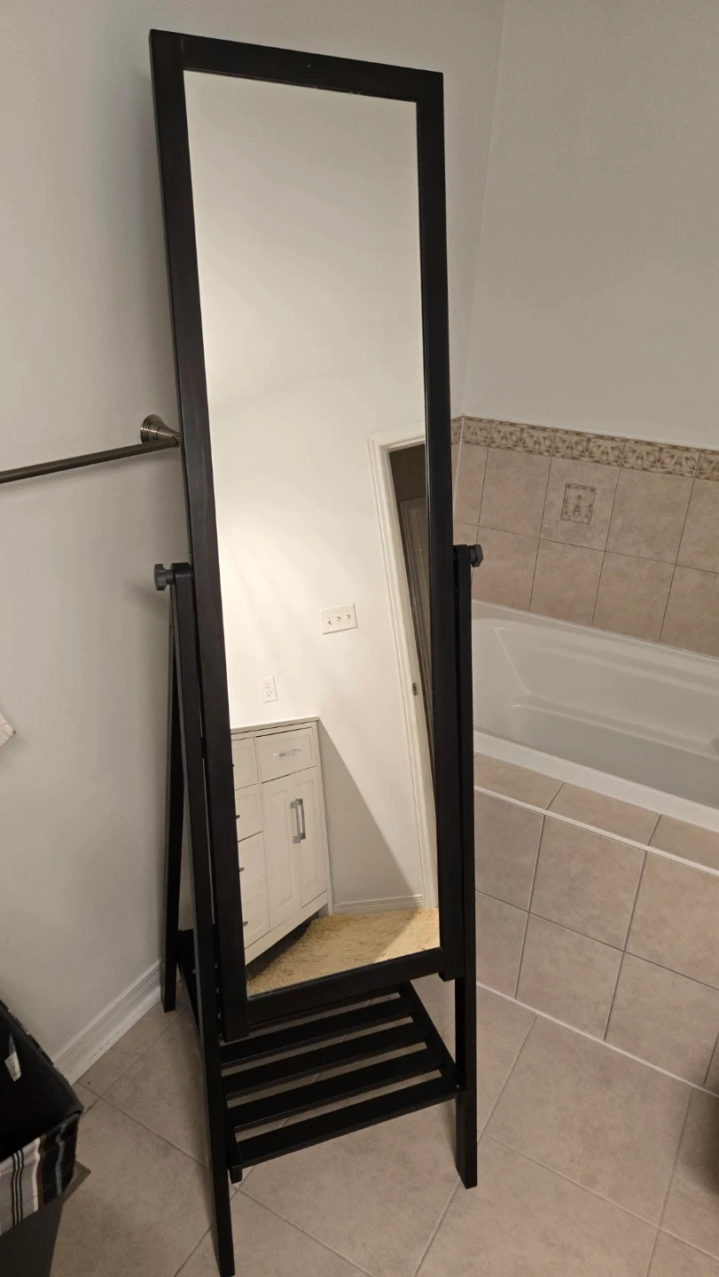 Buy & SellStanding Mirror with ShelfStanding Mirror with Shelf$44A tall standing mirror with a black wooden frame. It includes a lower shelf with horizontal slats, perfect for storing various items. WHERE TO MEETCheck LocationView MapSELLERJHBathurst150 reviews3 chats·1 favorites·65 viewsSEND CHAT TO SELLERHi JH! I’m interested in your listing.Hi JH! I’m interested in your listing.Get the Karrot app to chatSign In to chat