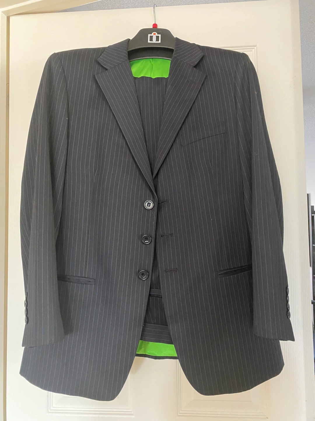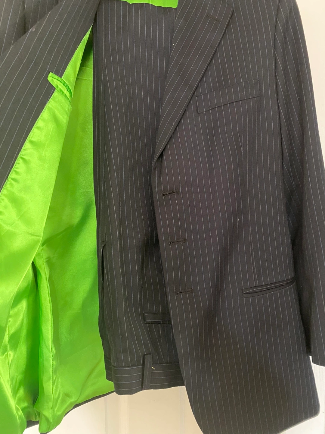 pinstripe suit. It's in great condition and features a vibrant green lining. Perfect for adding a touch of personality to your formal wear! Pants $25.