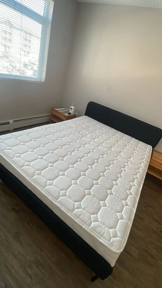 Selling a full-size upholstered bed frame in dark gray (IKEA style), including a mattress. Both the bed frame and mattress are in like-new condition — only purchased in October and barely used due to travel. Includes bed frame and mattress. Mattress is almost new (bought in October). Easy to assemble and disassemble. Strong and stable structure. Modern and minimalist design. Dimensions: Frame Length: 196 cm (77 1/8"), Frame Width: 139 cm (54 3/4"), Footboard height: 40 cm (15 3/4"), Headboard height: 85 cm (33 1/2"). Mattress Length: 189 cm (74 3/8"), Mattress Width: 135 cm (53 1/8"). Located in Airdrie, Calgary. Asking $500. Selling because I'm moving/traveling.