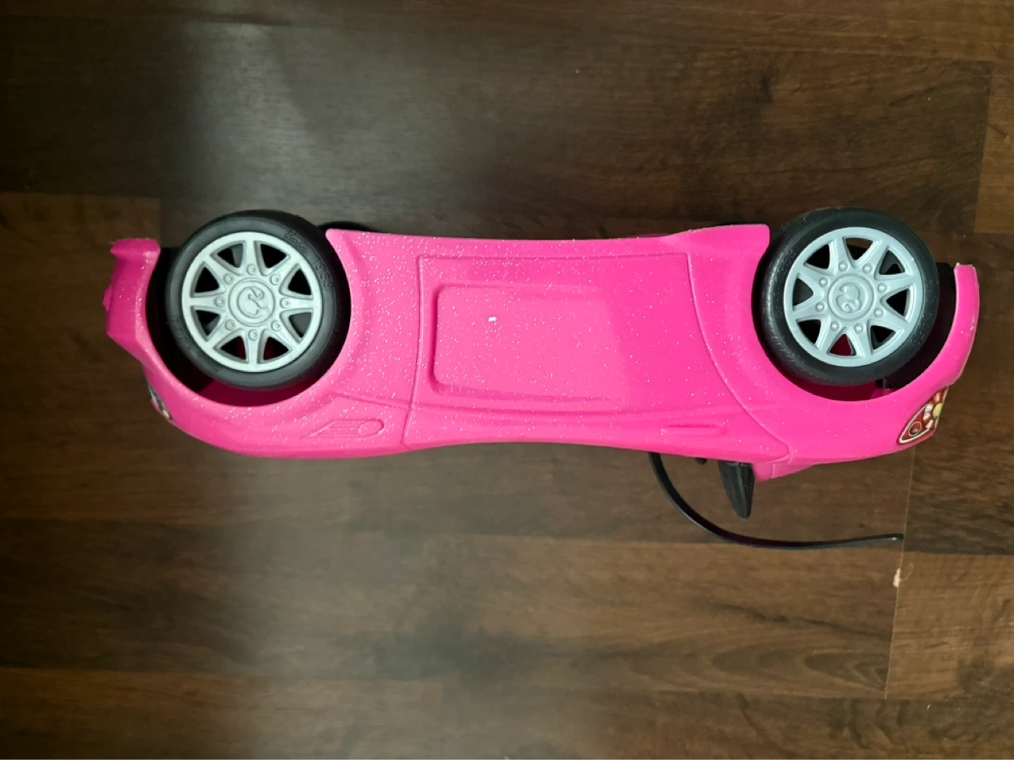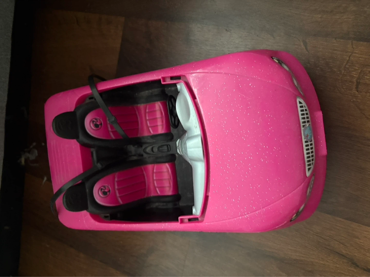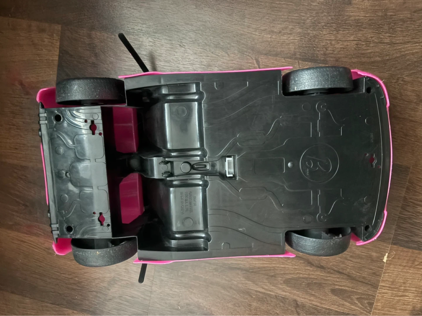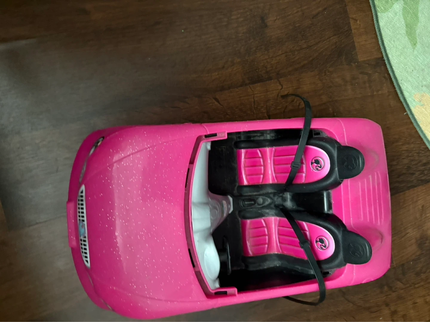 This is a pink Barbie convertible toy car. It has two seats inside and a steering wheel. It's made of plastic and is glittery. This car is suitable for dolls.