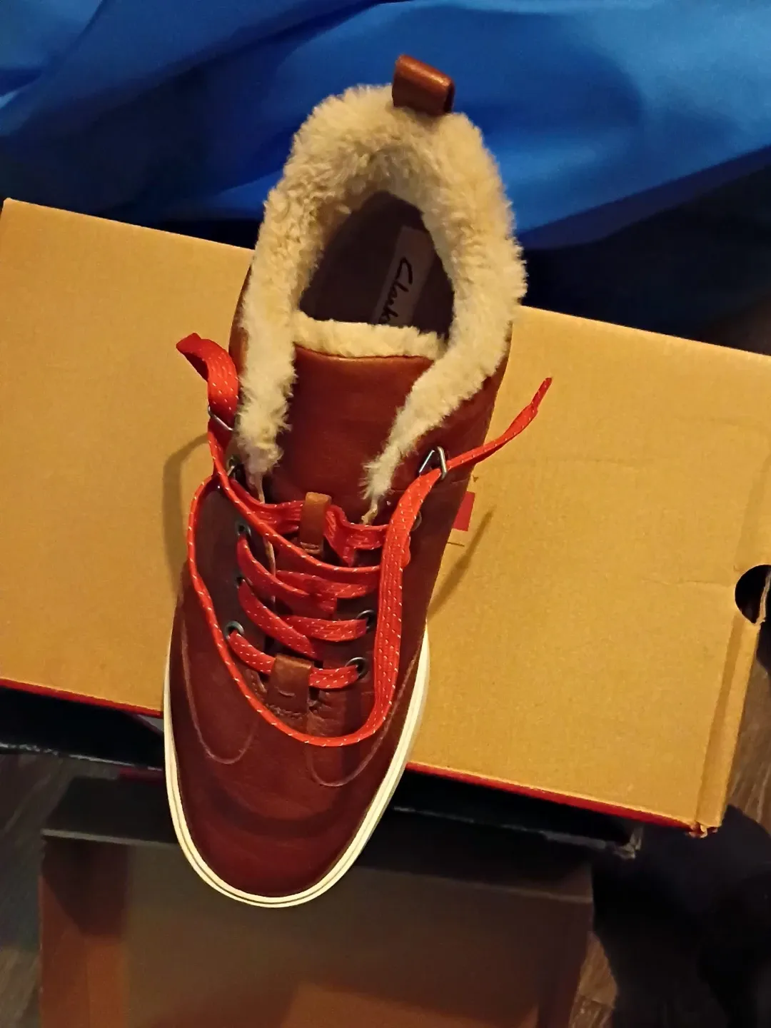 These brown leather shoes feature a cozy shearling lining for added warmth. They have red laces and a durable white sole. They're great for casual wear in cooler weather.