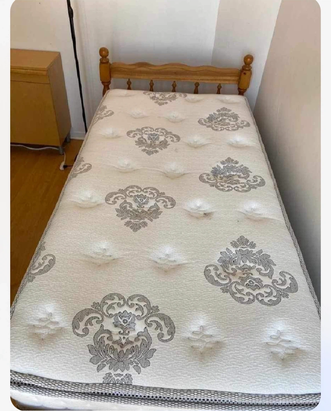 twin size mattress. It has a cream colour with a grey patterned design. It's in good condition and ready for a new home. Medium soft.