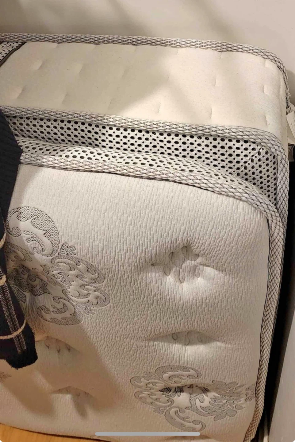 twin size mattress. It has a cream colour with a grey patterned design. It's in good condition and ready for a new home. Medium soft.