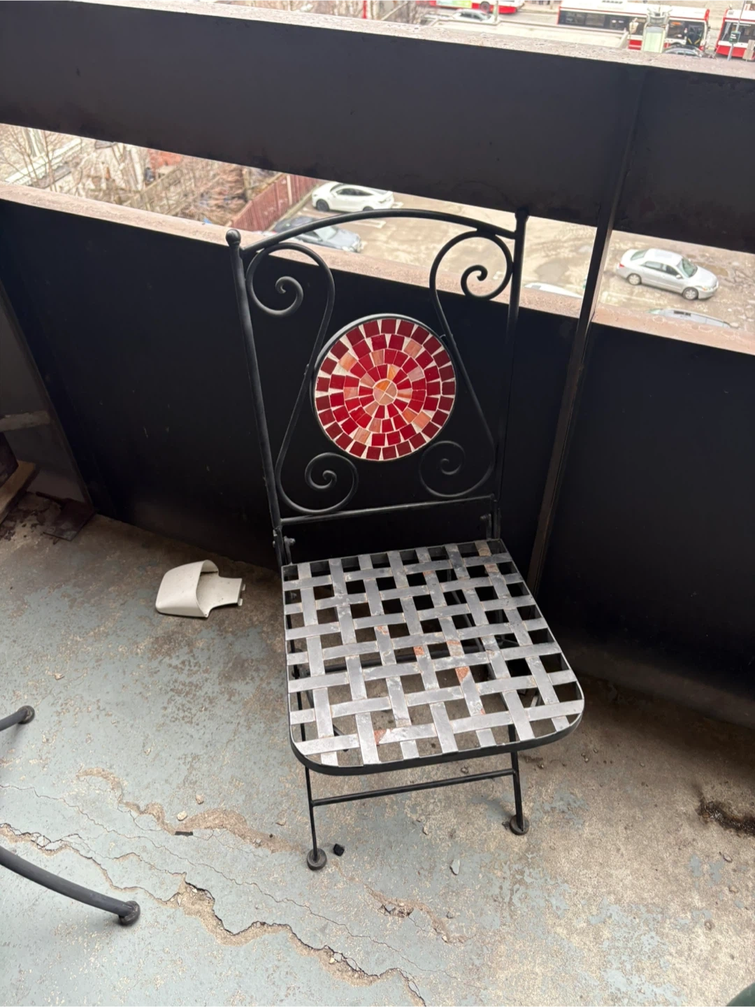 Charming mosaic bistro set with a round table and a matching chair. Features a colourful mosaic design on the tabletop and chair backrest. Perfect for small outdoor spaces like balconies or patios. Durable metal frame.