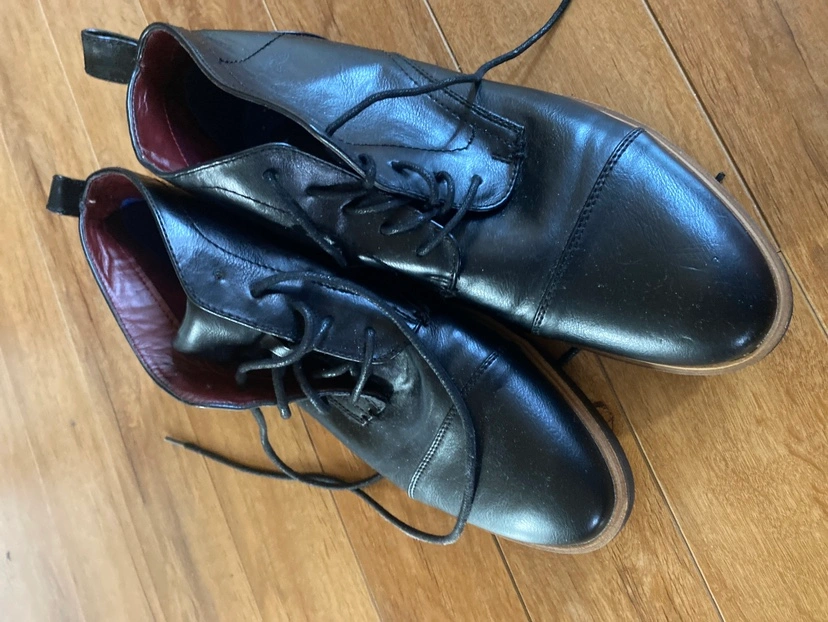 Black leather boots with a lace up closure and a round toe.