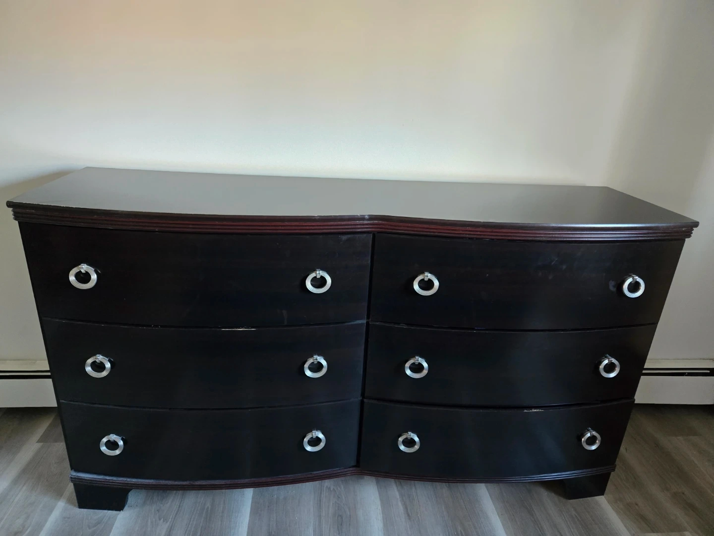 A set of dark wood bedroom furniture. Includes a tall dresser with five drawers long dresser with 6 drawers and two nightstands with two drawers each. Silver ring pull hardware.