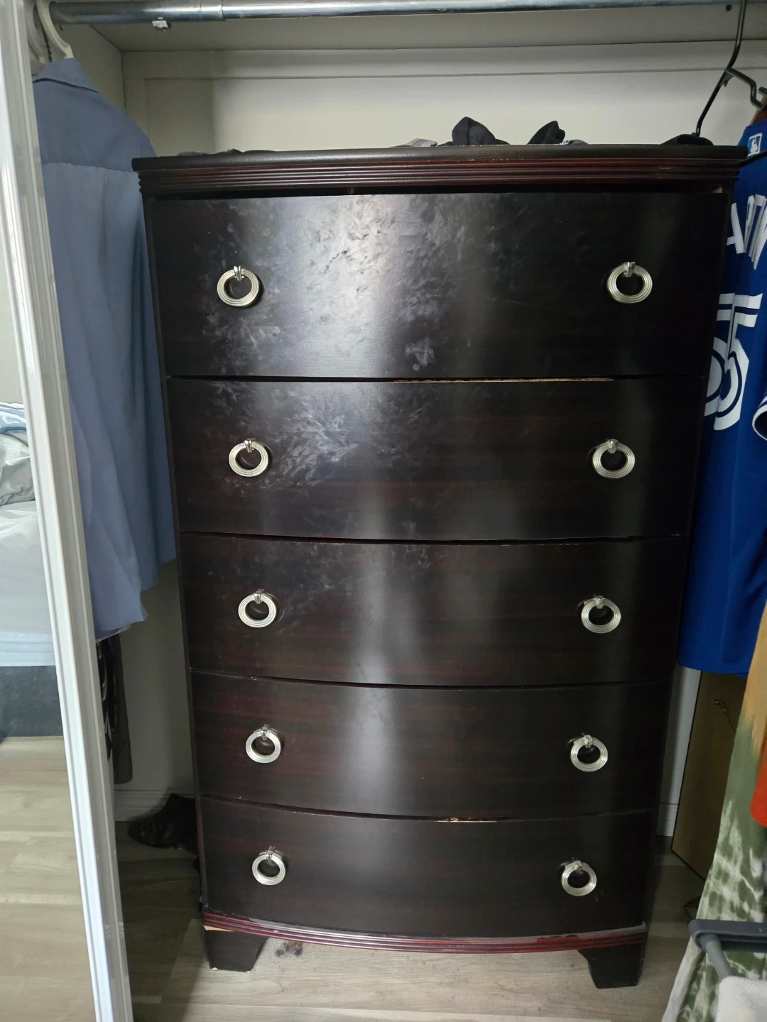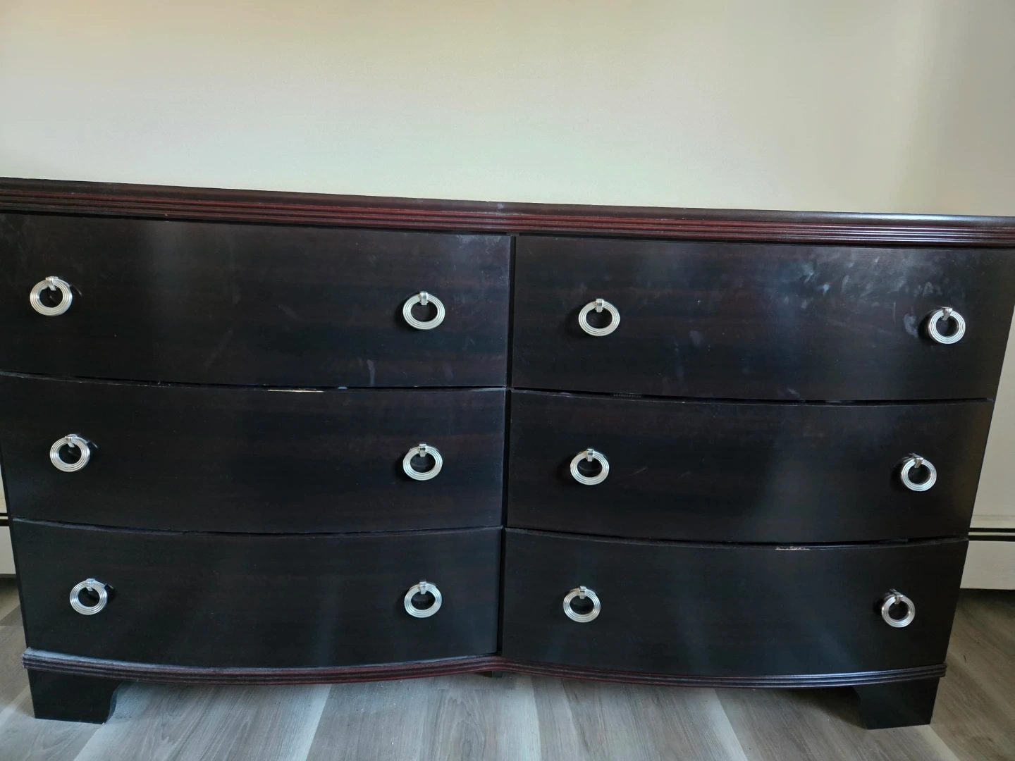 A set of dark wood bedroom furniture. Includes a tall dresser with five drawers long dresser with 6 drawers and two nightstands with two drawers each. Silver ring pull hardware.