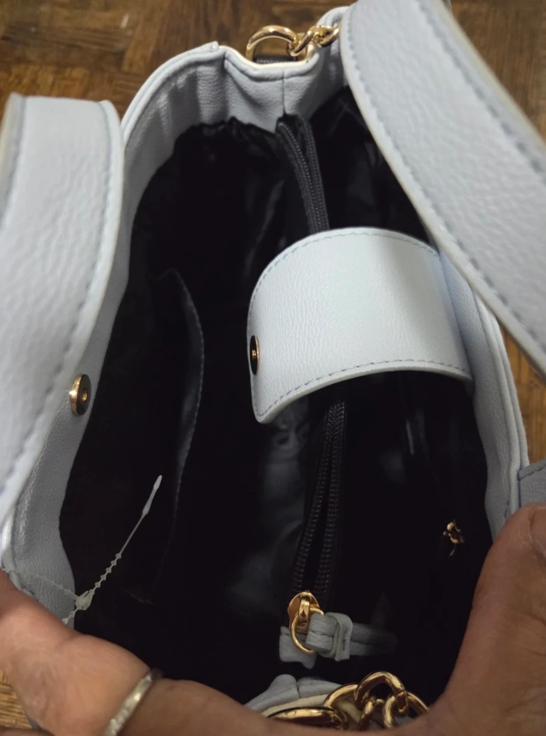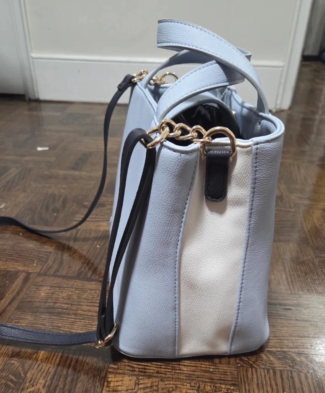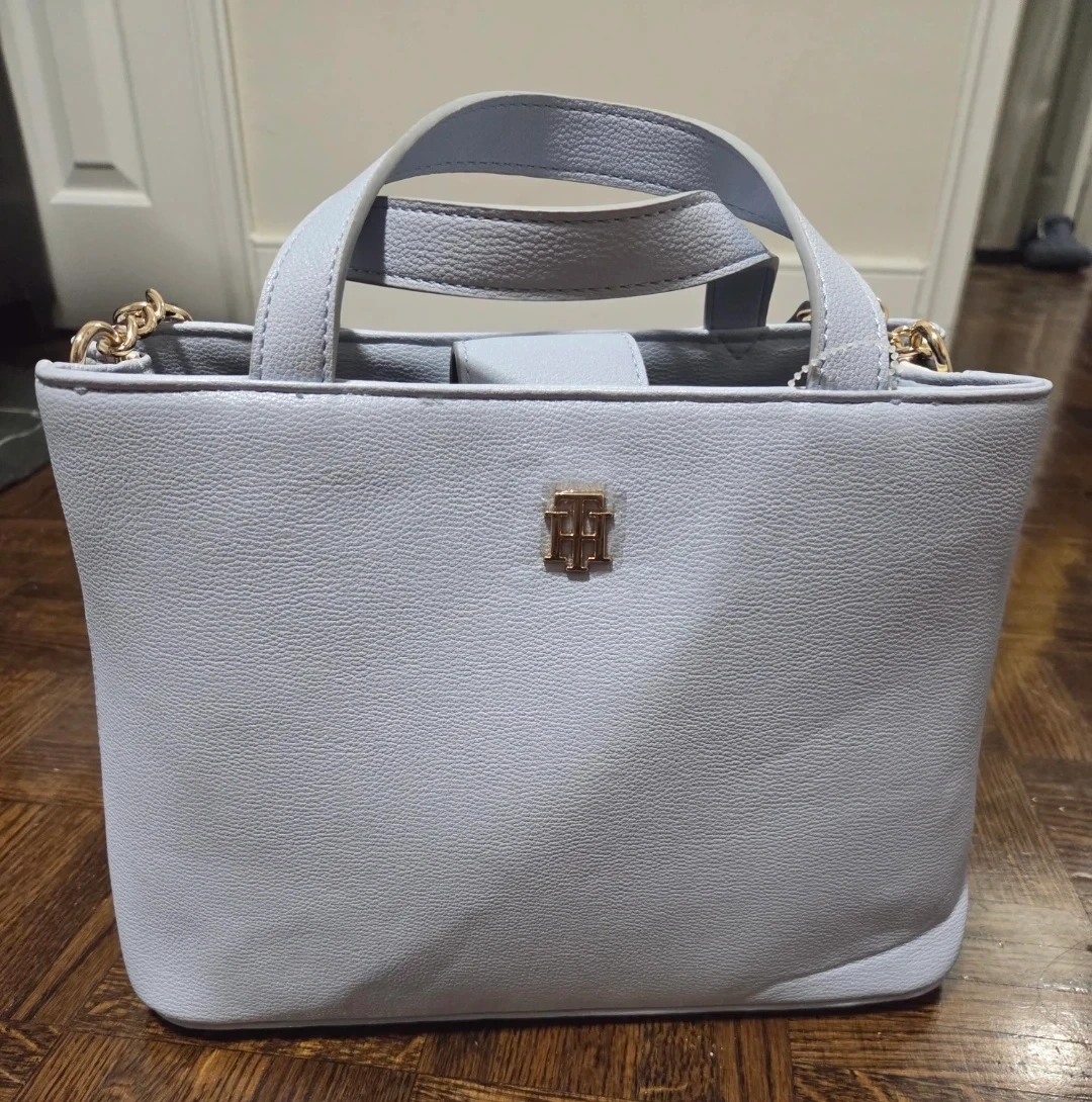 This is a light blue Tommy Hilfiger handbag with gold hardware and a chain detail. It has a fabric interior with a zippered pocket. It also comes with a detachable shoulder strap.