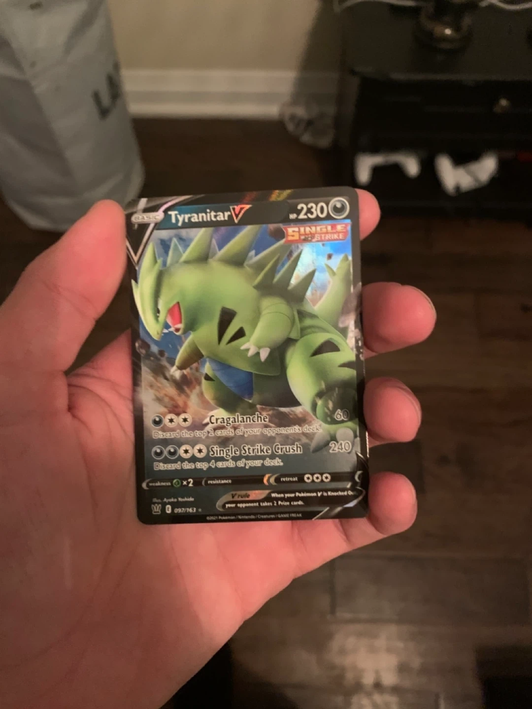 Selling a Tyranitar V Single Strike Pokemon card! It's in great condition and ready for a new collection