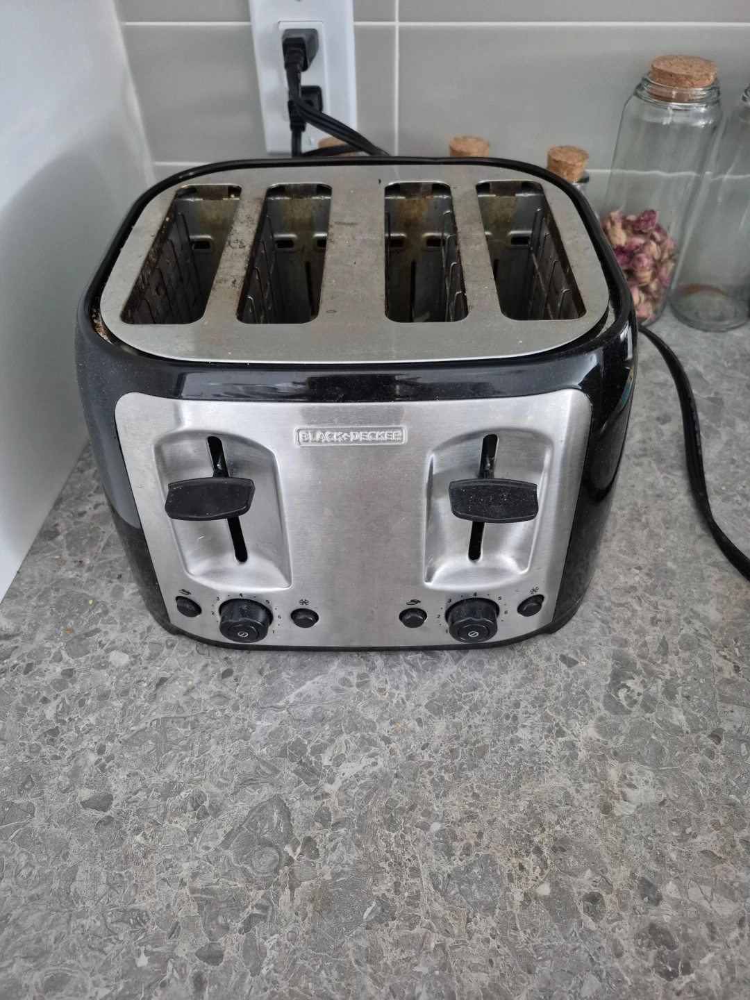 This is a BLACK+DECKER 4-slice toaster but only 2 works. It features dual browning controls and a stainless steel finish. It has wide slots for bagels and thicker breads.