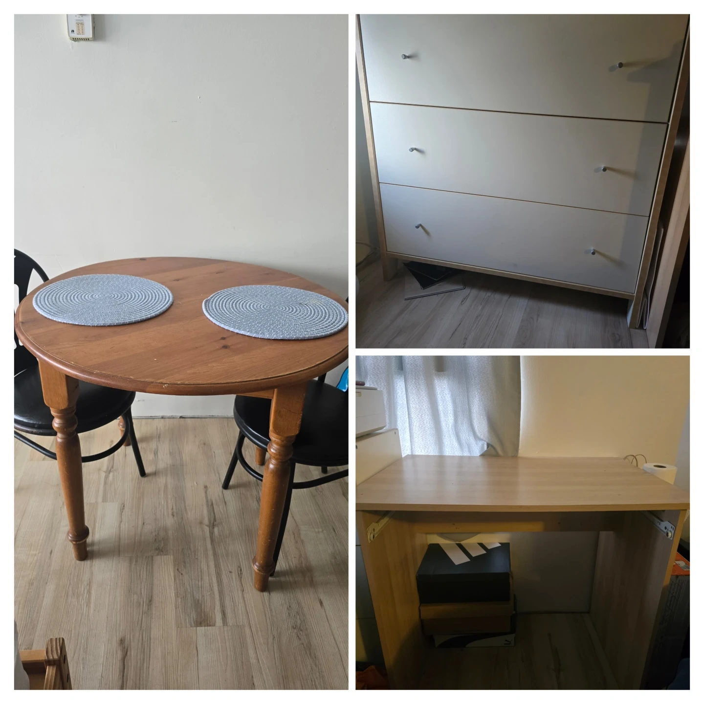 A charming wooden round dining table with two black chairs. It's perfect for smaller dining areas or as a cozy breakfast nook set. This set includes the table and 2 chairs. also there is a computer desk and a small three drawer White dresser