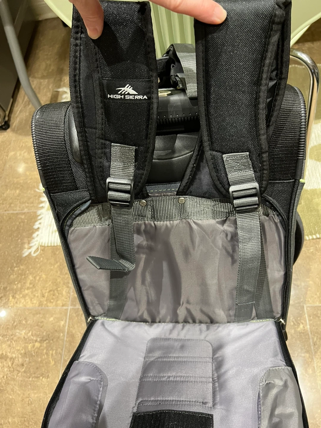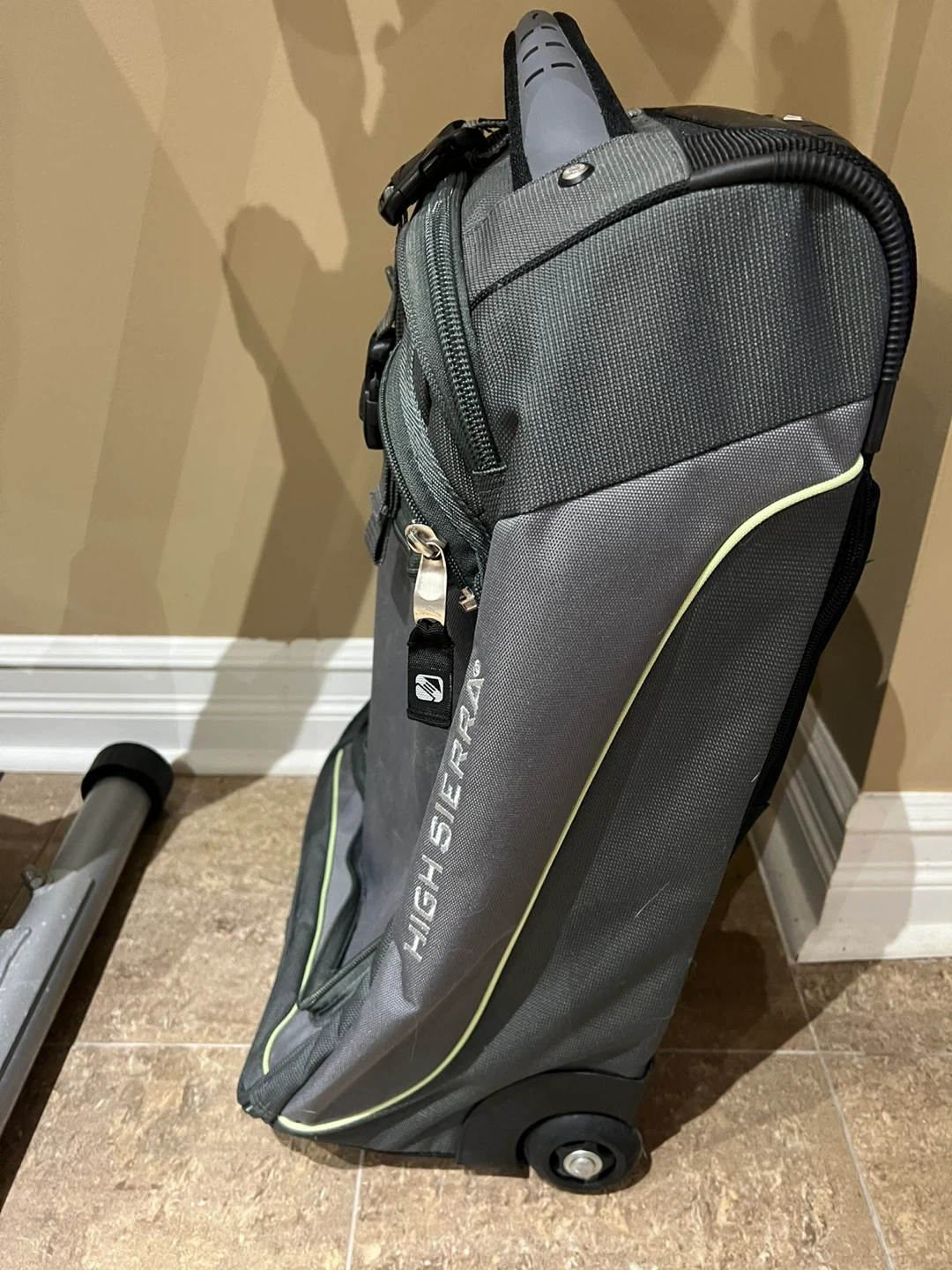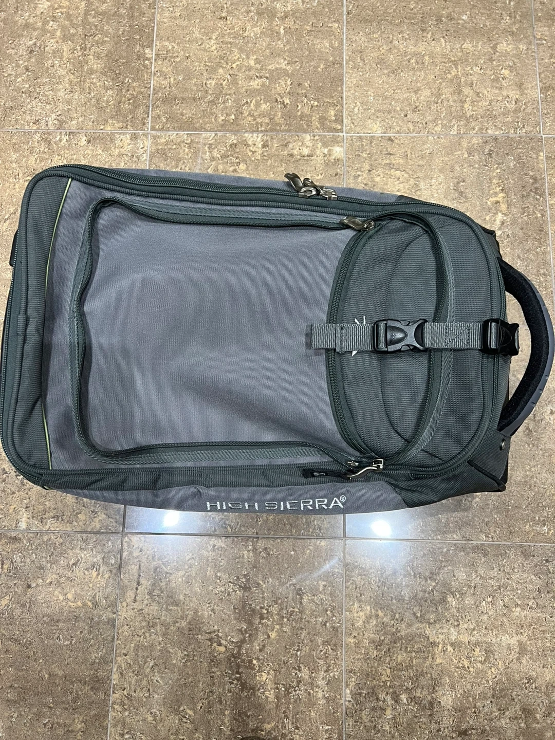 This High Sierra rolling carry-on luggage is black and grey. It features a telescoping handle and two wheels for easy transport. Plenty of compartments for your travel essentials!