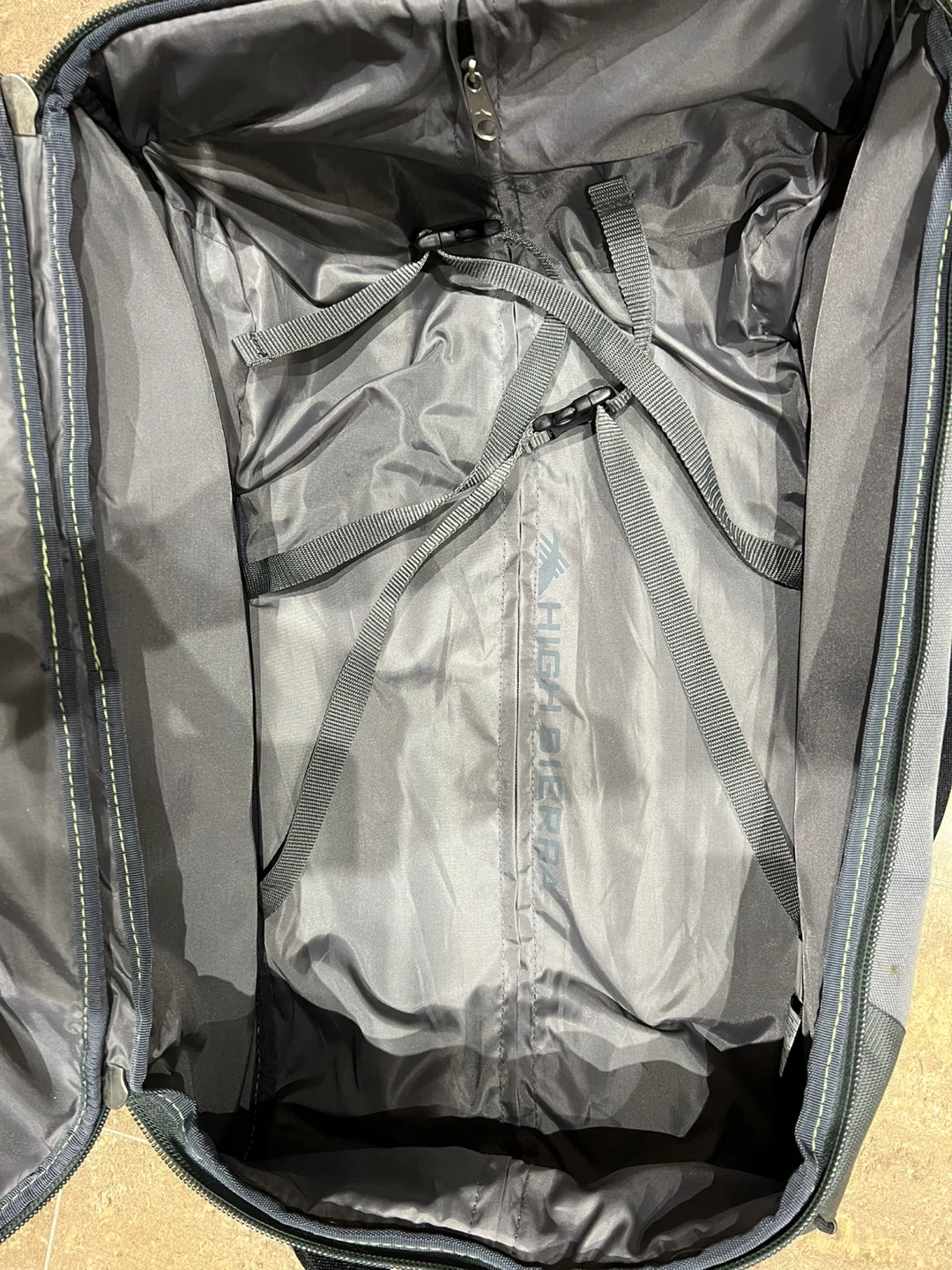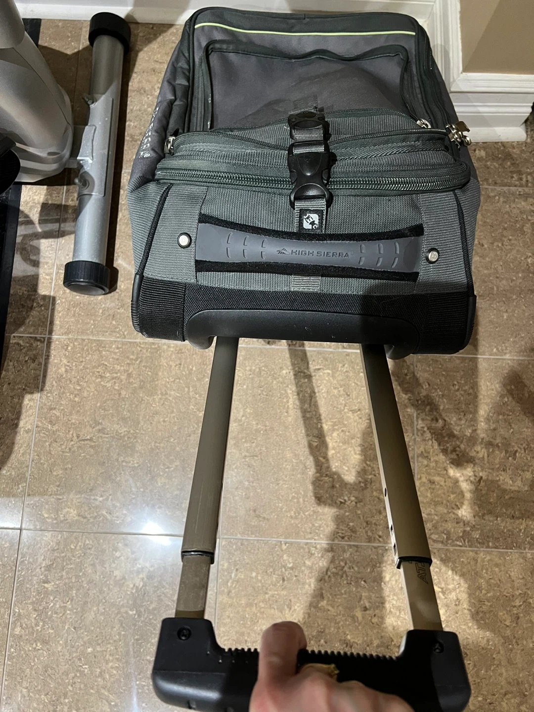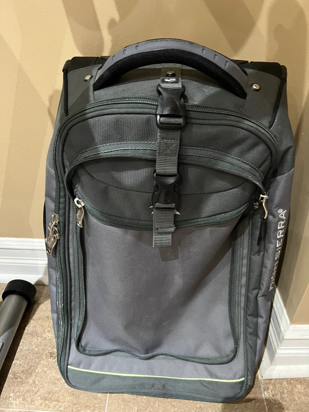 This High Sierra rolling carry-on luggage is black and grey. It features a telescoping handle and two wheels for easy transport. Plenty of compartments for your travel essentials!