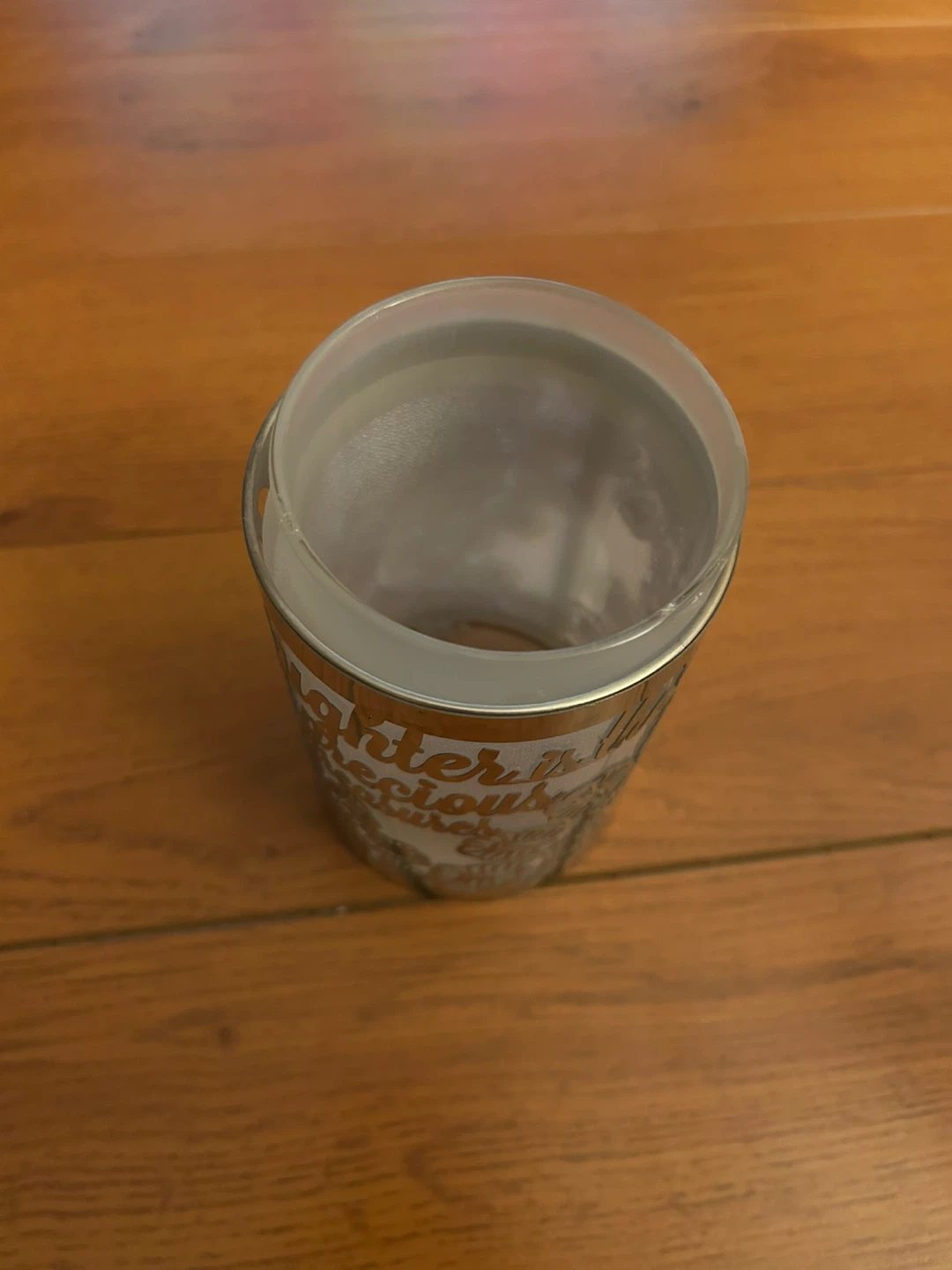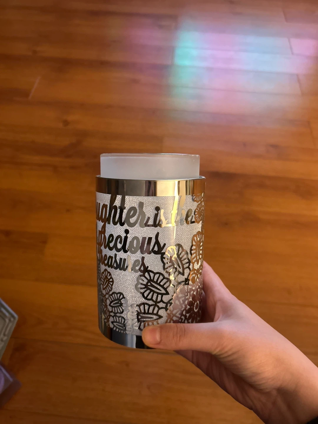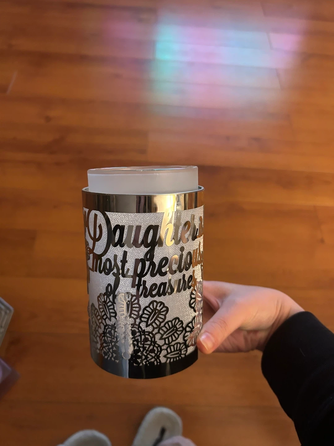 Selling a decorative candle holder with "Daughter is most precious treasure" printed on it. It has a silver and gold sparkly design with floral accents. This would make a thoughtful gift for a daughter!