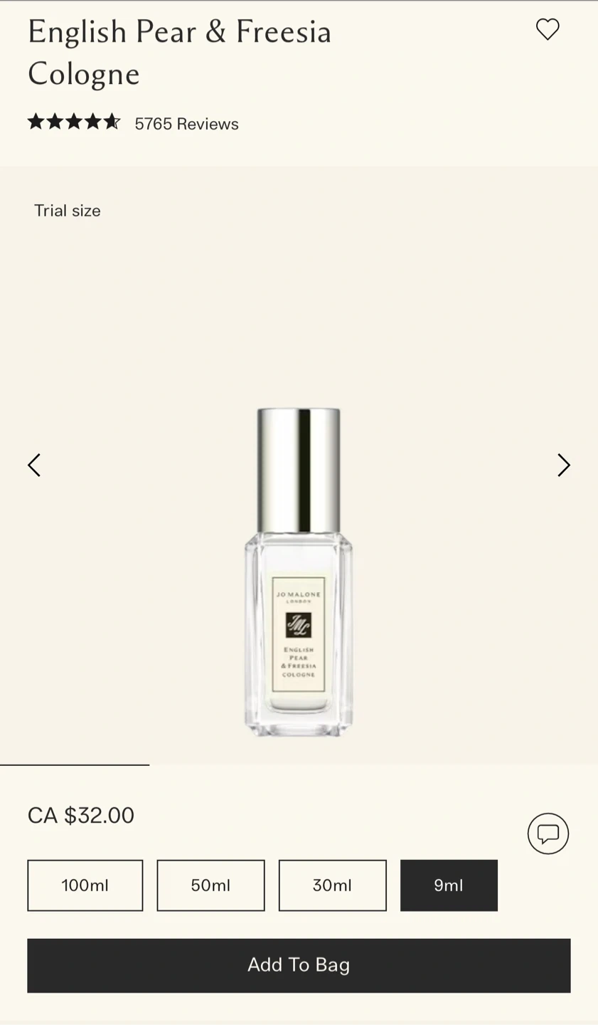 Jo Malone London English Pear & Freesia Cologne in a trial size bottle. It's a popular scent. This is a 9ml bottle. it’s $32 plus tax online.