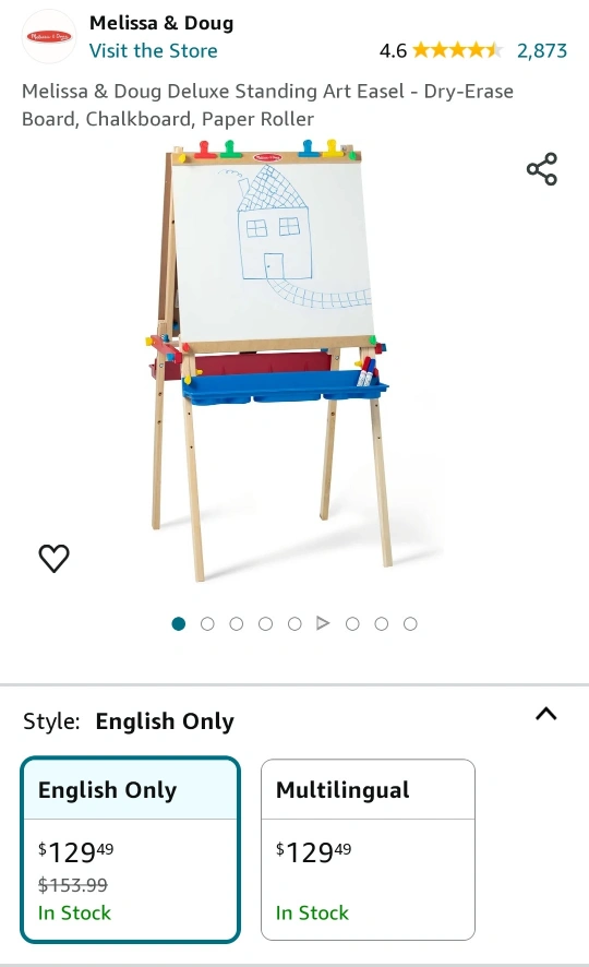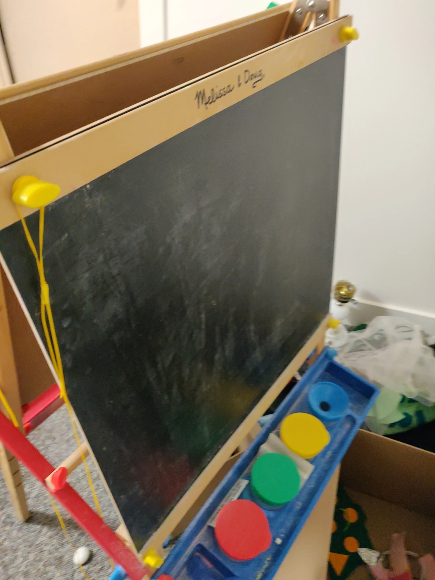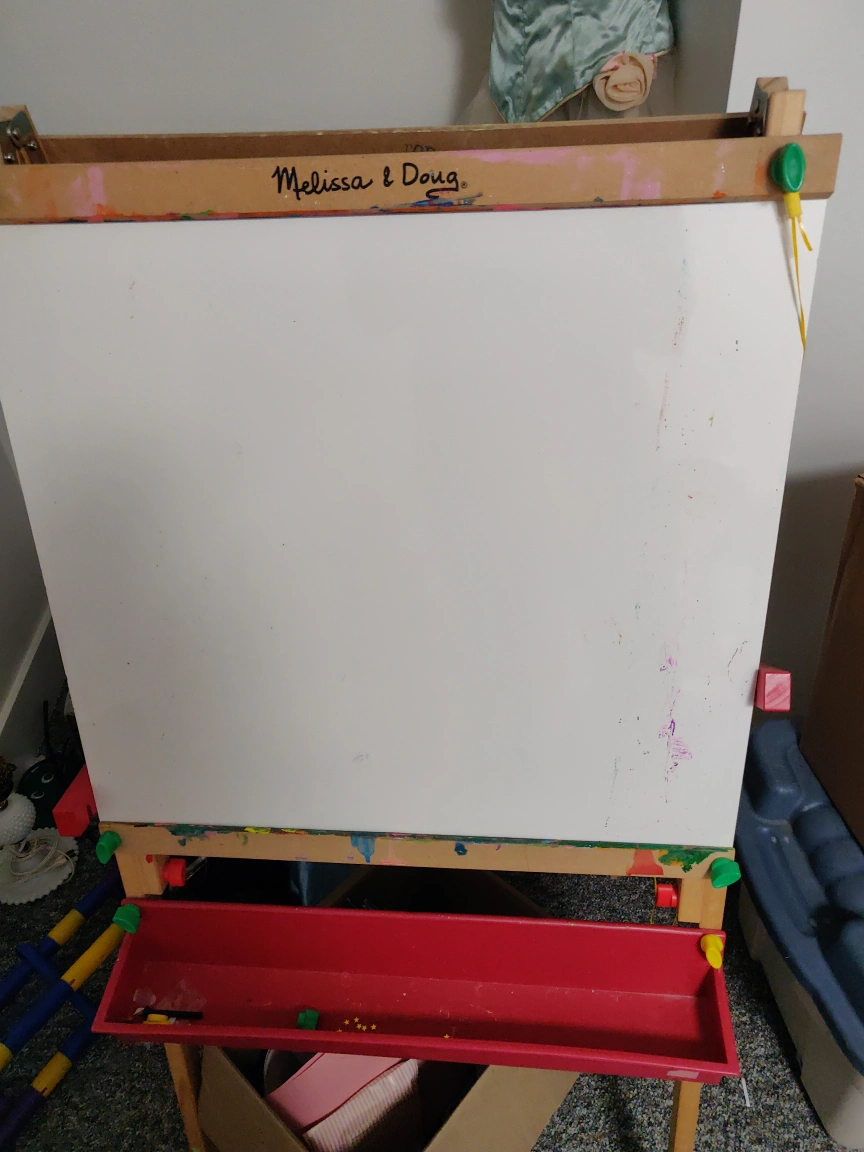 Buy & SellMelissa & Doug Deluxe Standing Art EaselMelissa & Doug Deluxe Standing Art Easel$30Wooden easel with a chalkboard, dry-erase board, paper roll holder, and a tray for supplies.ConditionGoodAge3-5 yearsWHERE TO MEETCheck LocationView MapSELLERverifiedJoelOld University1105 reviews0 chats·0 favorites·5 viewsSEND CHAT TO SELLERHi Joel! I’m interested in your listing.Hi Joel! I’m interested in your listing.Get the Karrot app to chatSign In to chat