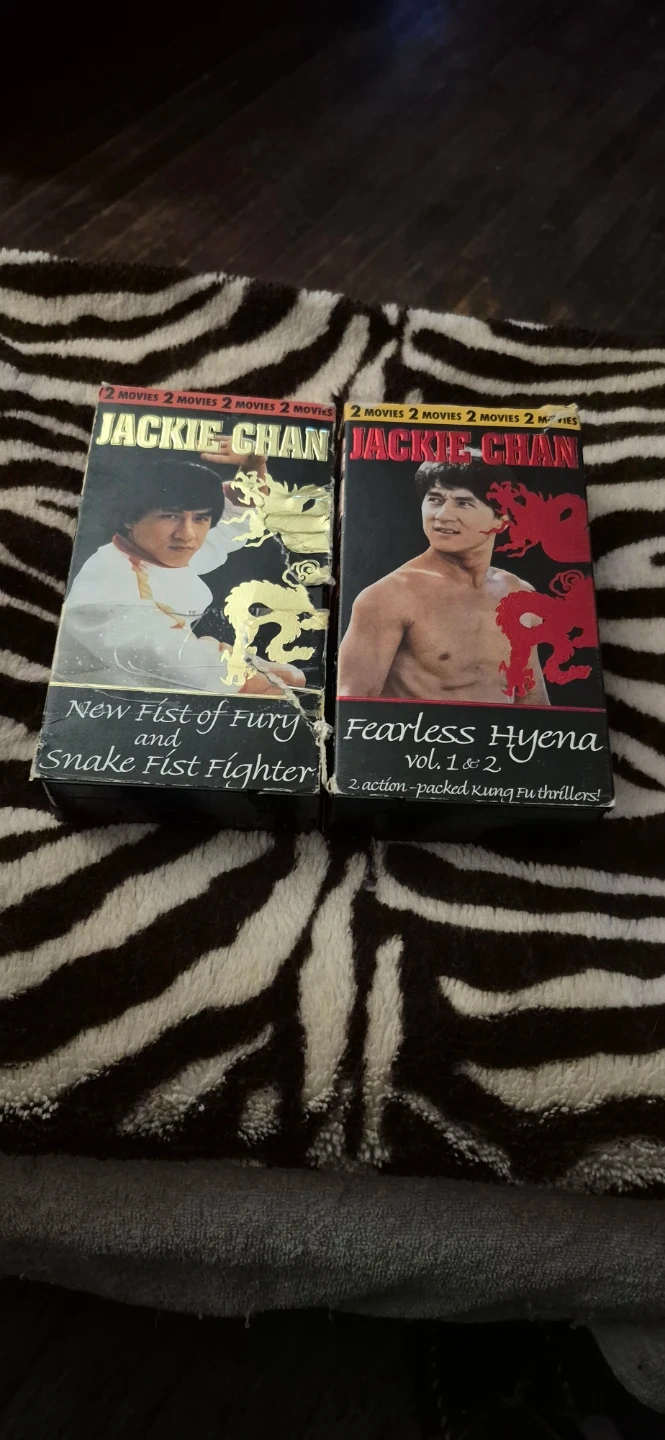 Two VHS sets featuring Jackie Chan. One includes 'New Fist of Fury' and 'Snake Fist Fighter', each with 2 movies. The other has 'Fearless Hyena' vol. 1 & 2, also 2 action-packed Kung Fu thrillers. These are great for any classic martial arts film enthusiast!