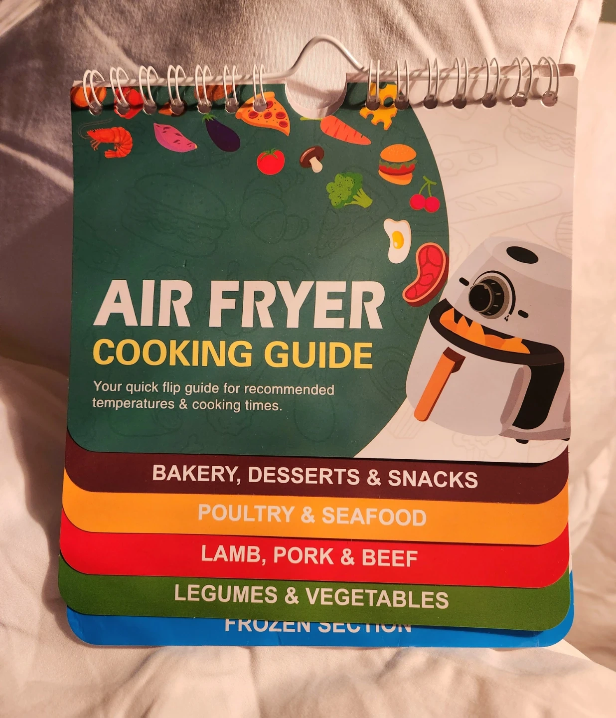 Selling an air fryer cooking guide. It's a quick flip guide for recommended temperatures and cooking times. Includes sections for bakery, desserts & snacks, poultry & seafood, lamb, pork & beef, legumes & vegetables, and frozen sections.