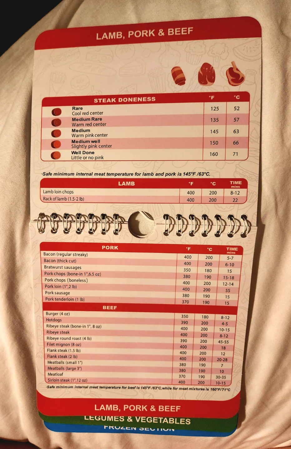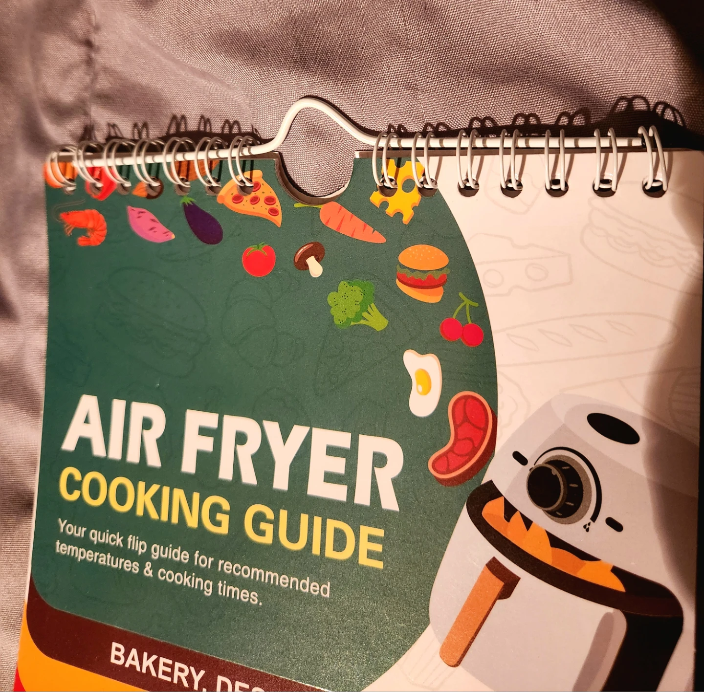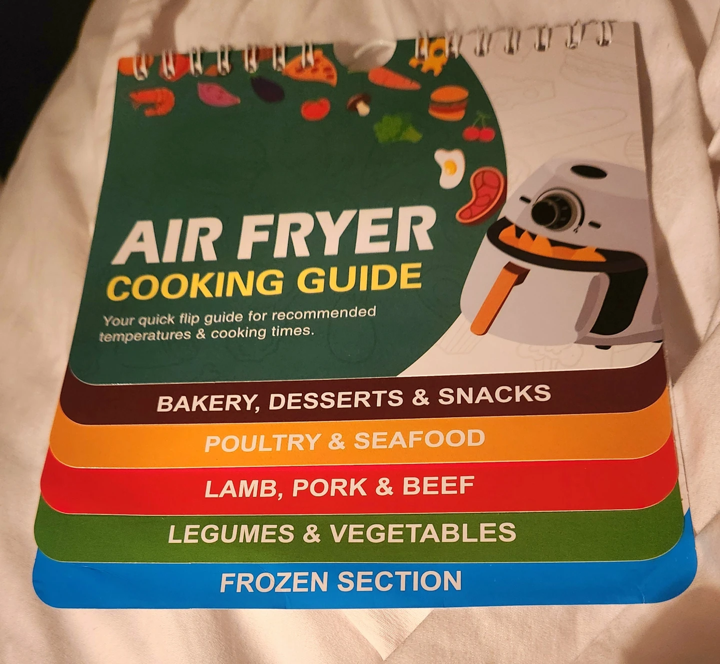Selling an air fryer cooking guide. It's a quick flip guide for recommended temperatures and cooking times. Includes sections for bakery, desserts & snacks, poultry & seafood, lamb, pork & beef, legumes & vegetables, and frozen sections.