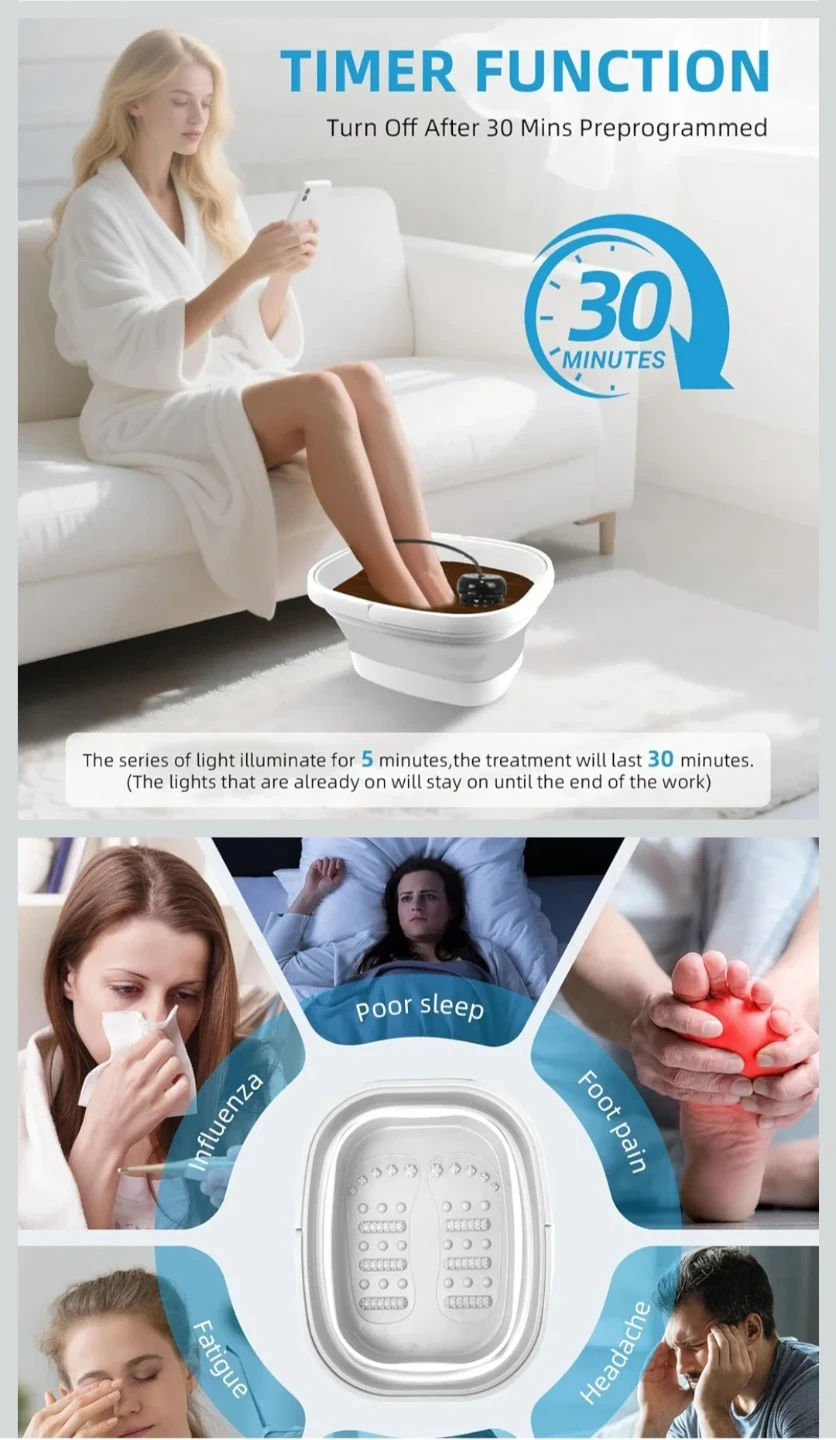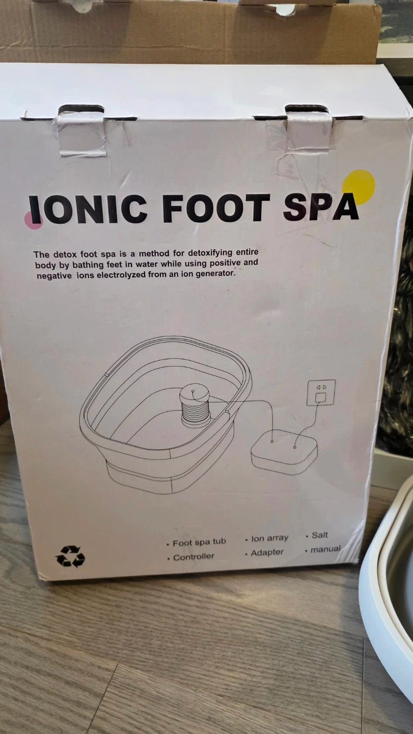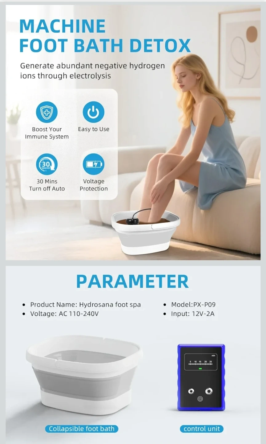 Detox foot spa for refreshing your feet. This Ionic Foot Spa machine generates negative hydrogen ions through electrolysis. It features a 30-minute auto shut-off timer for convenience. The collapsible design makes it easy to store.