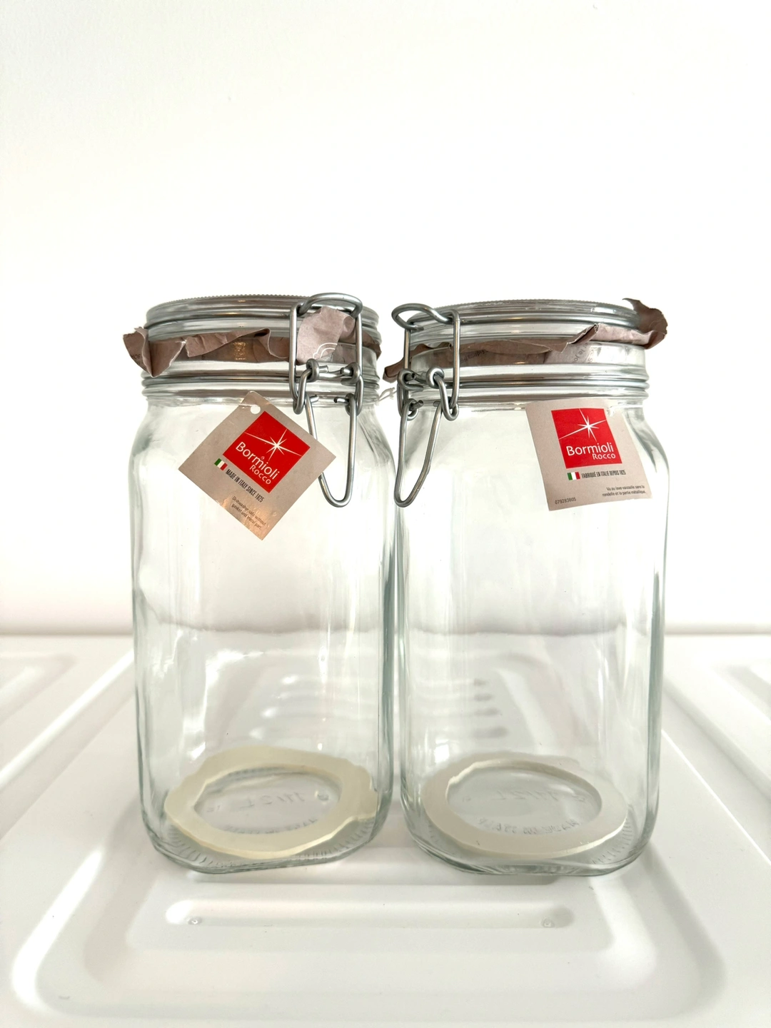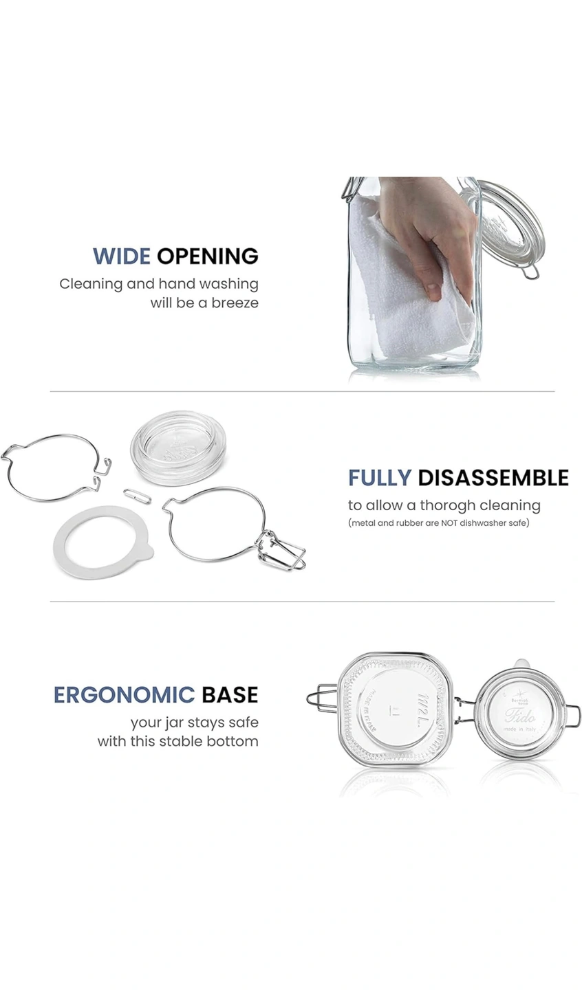Bormioli Rocco Fido Clear Glass Jar with 85 mm Gasket, 1.5 Liter (Pack of 2). Airtight Rubber Seal & Glass Lid, With Stainless Wire Clamp. Made in Italy.