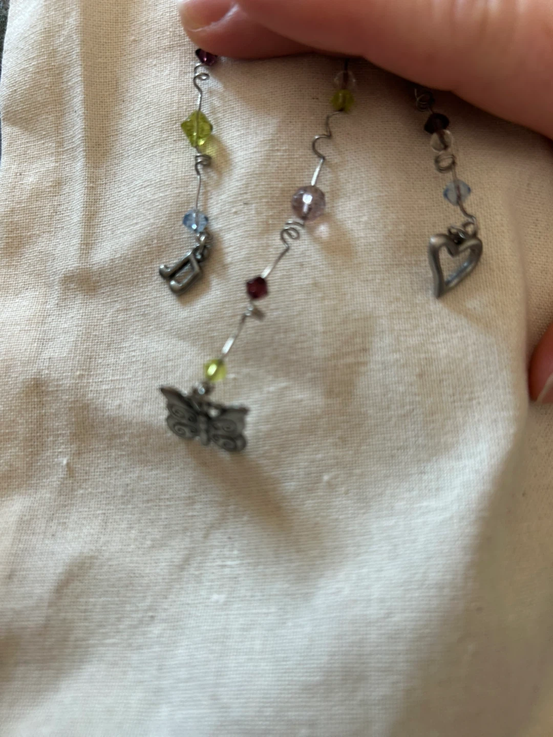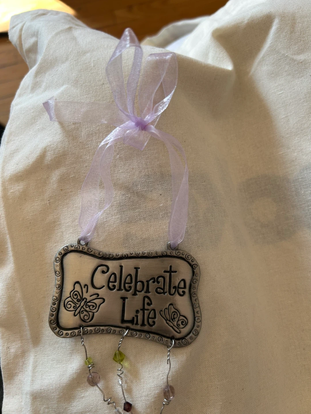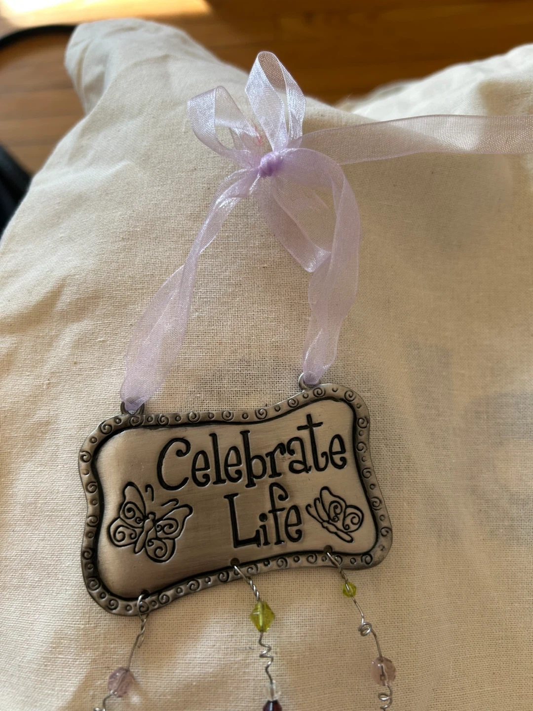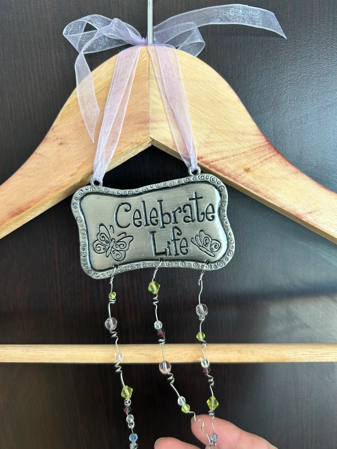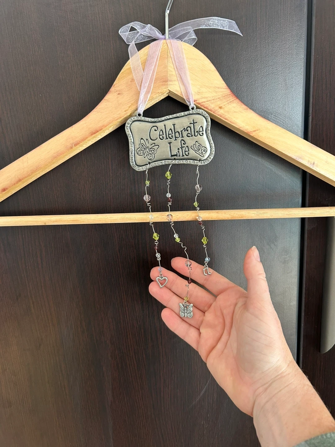 This decorative piece features a "Celebrate Life" plaque with butterfly accents. It hangs from a ribbon and includes beaded strands with charms like hearts and butterflies. Great for adding a cheerful touch to your space!