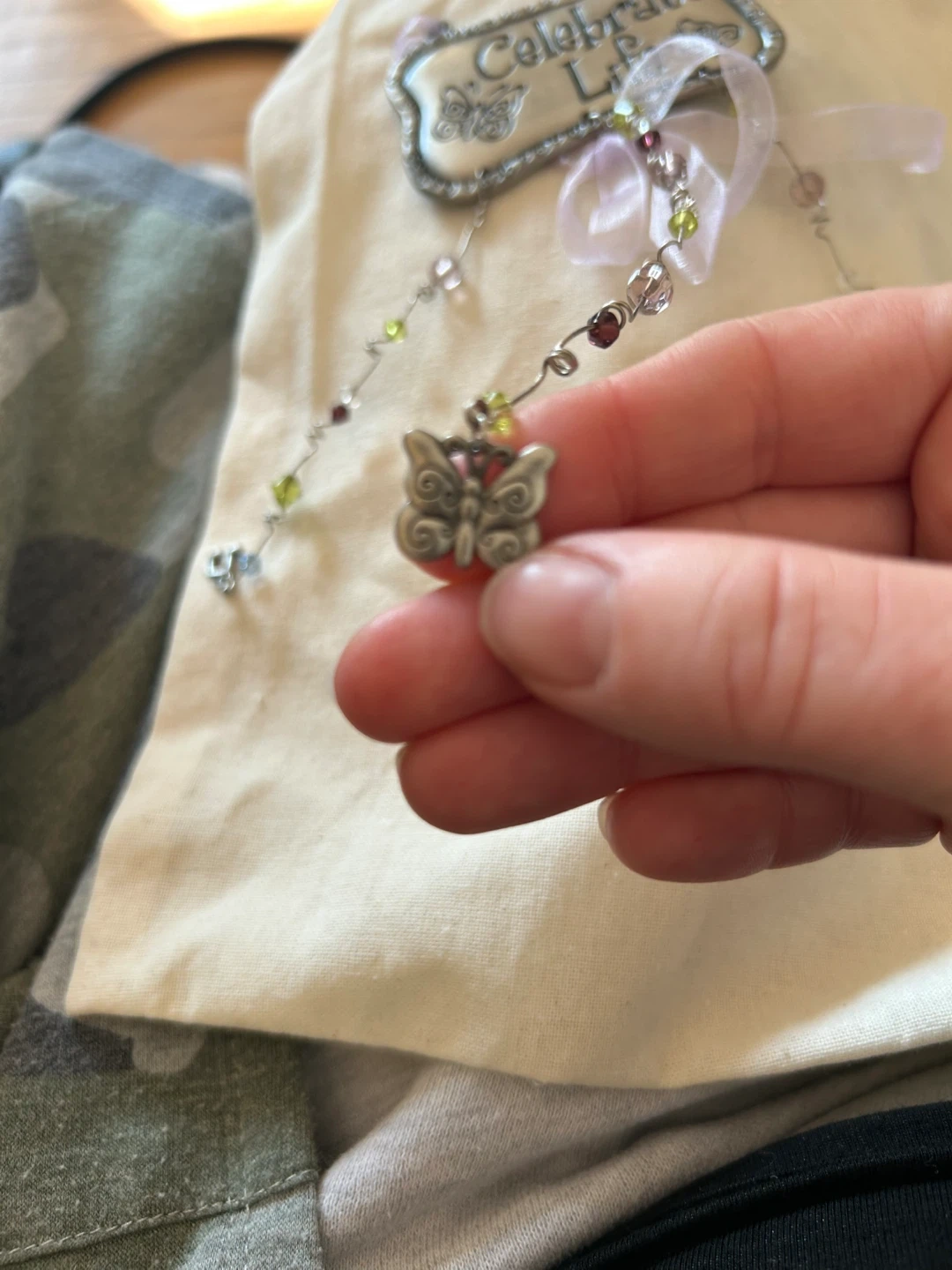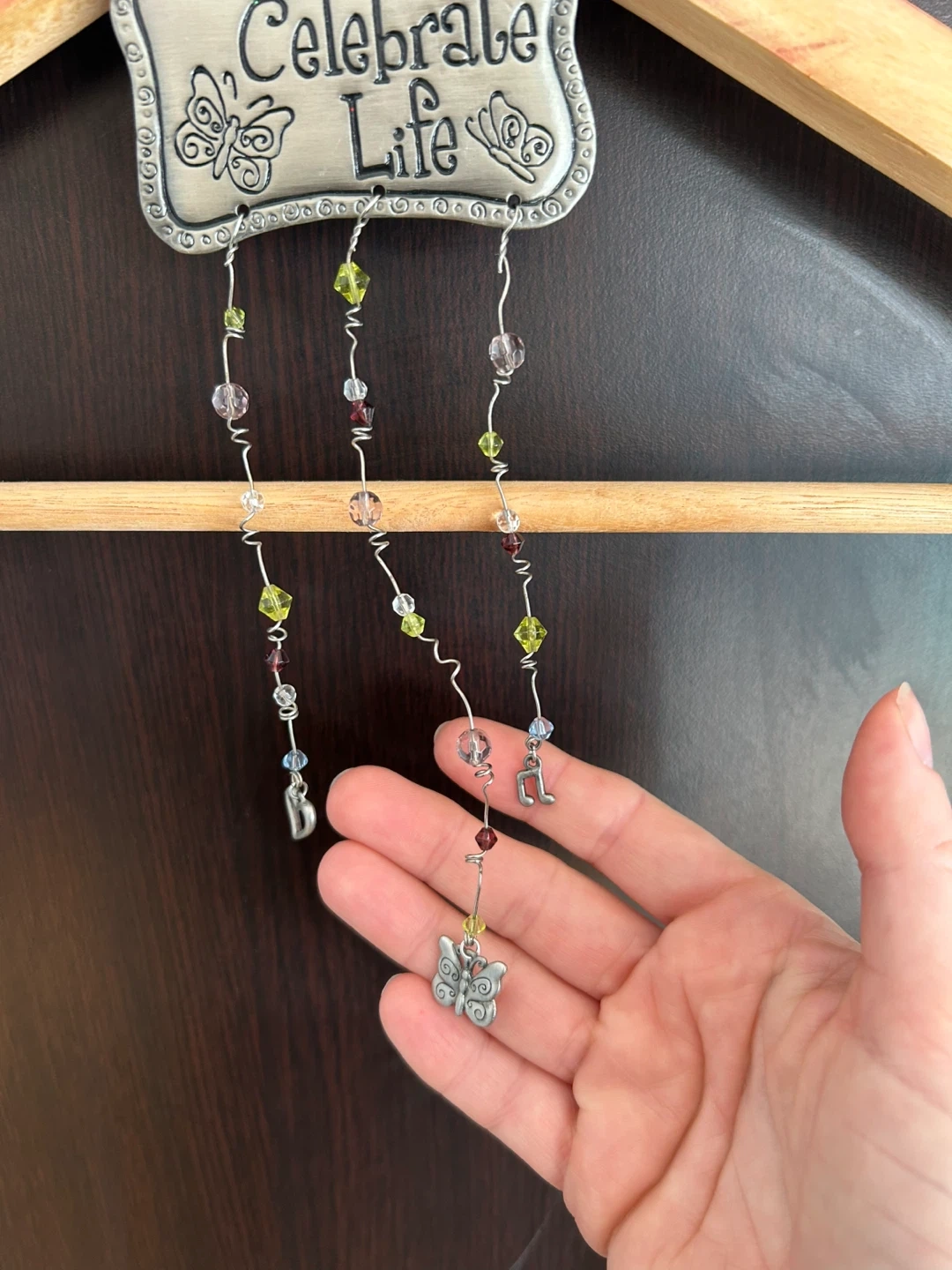This decorative piece features a "Celebrate Life" plaque with butterfly accents. It hangs from a ribbon and includes beaded strands with charms like hearts and butterflies. Great for adding a cheerful touch to your space!