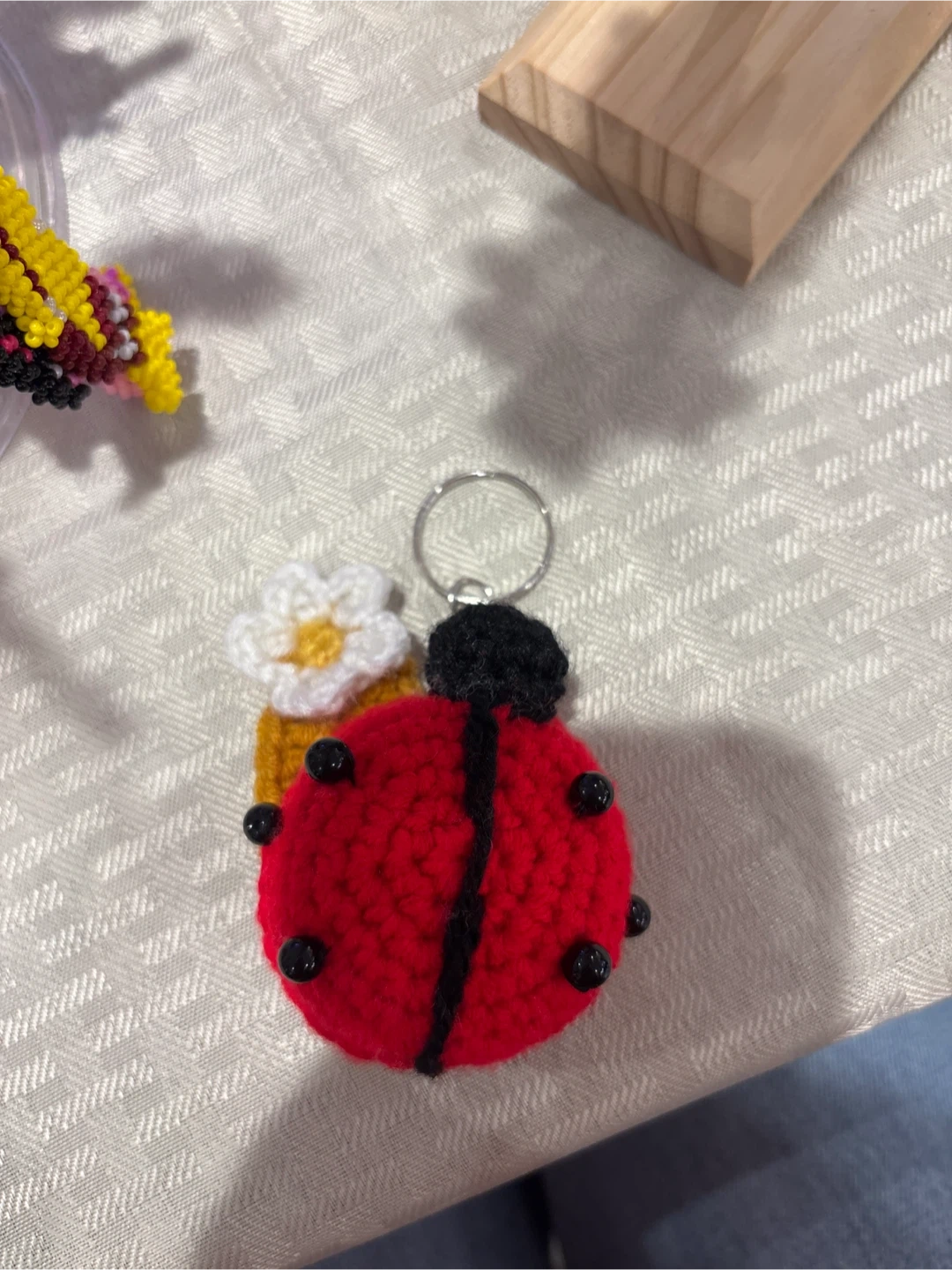 I'm selling a cute, handmade crochet ladybug keychain! It's red with black accents and has a little white and yellow flower attached. Perfect for adding a touch of whimsy to your keys or bag!