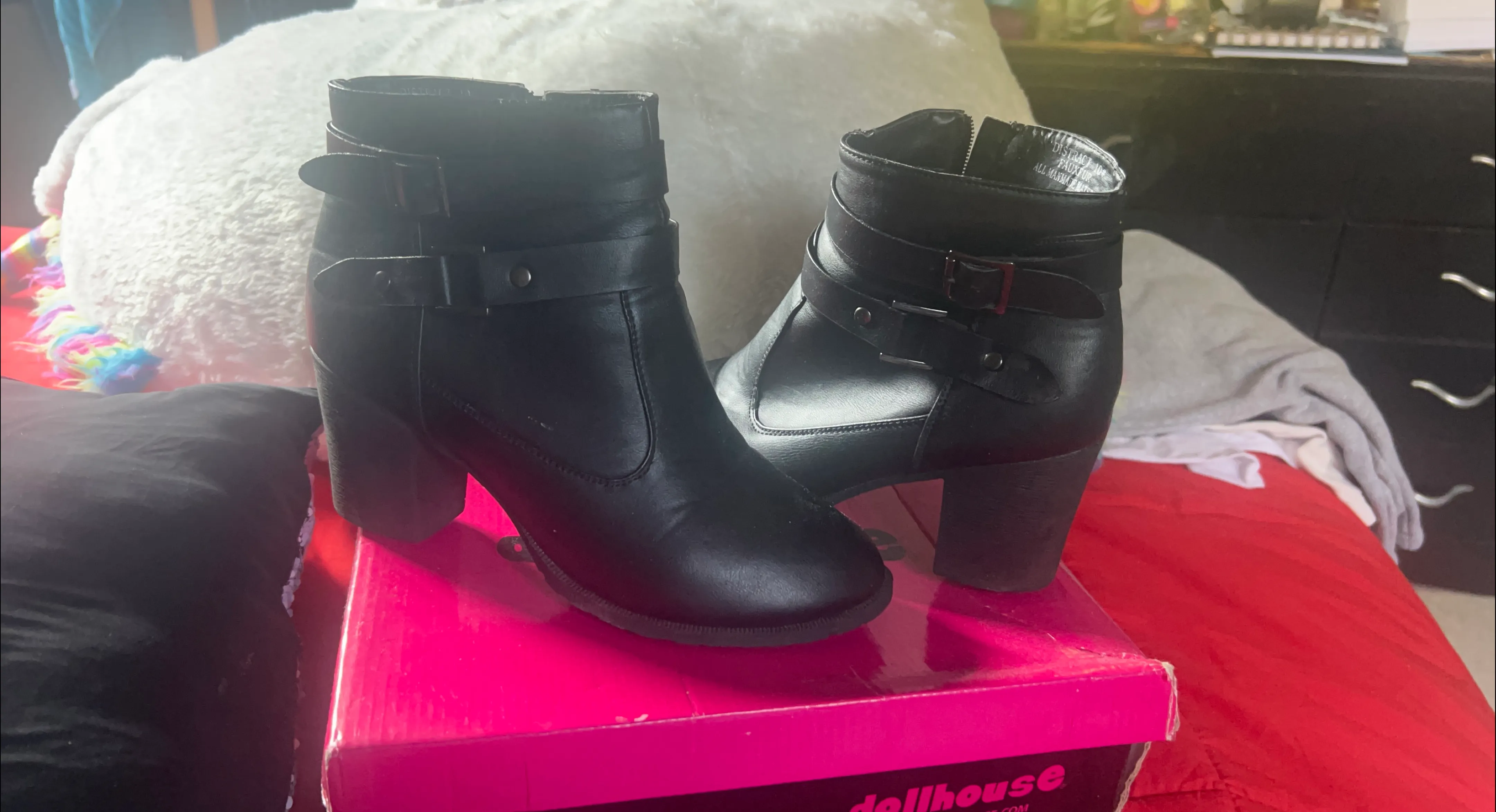 Selling a pair of Dollhouse black ankle boots. They have a stylish design with buckle straps and a comfortable heel height. Perfect for adding a bit of edge to any outfit!