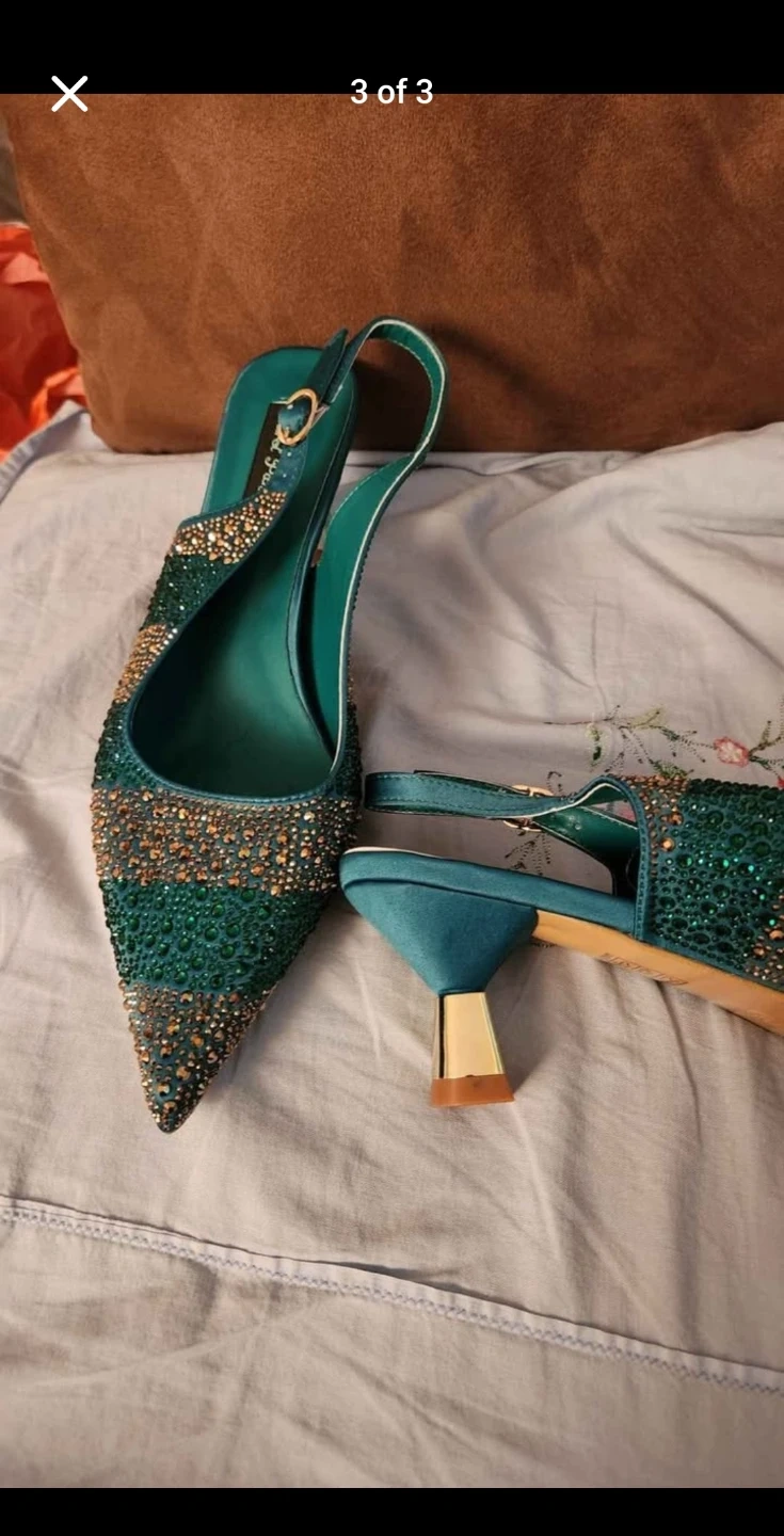 Sparkly green slingback heels adorned with rhinestones. These stylish shoes feature a pointed toe and a low block heel. Perfect for a night out or a special occasion!