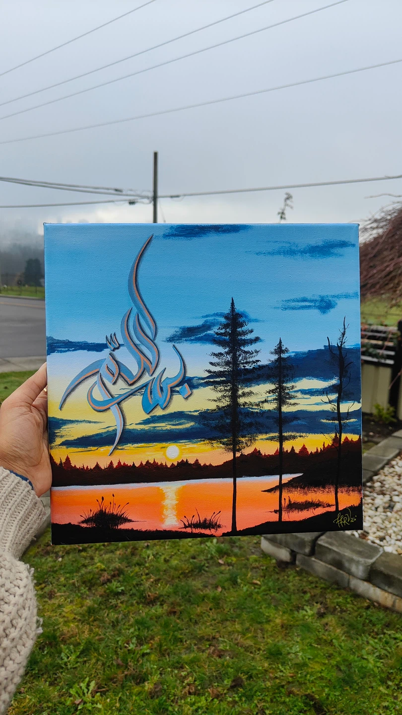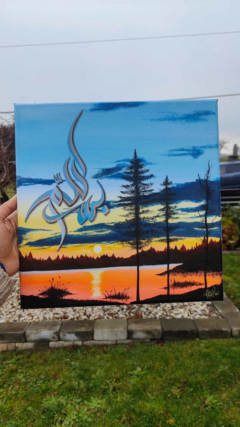 Beautiful hand-painted canvas featuring Islamic calligraphy over a serene sunset lake scene. The artwork is in great condition and would be a lovely addition to any home.