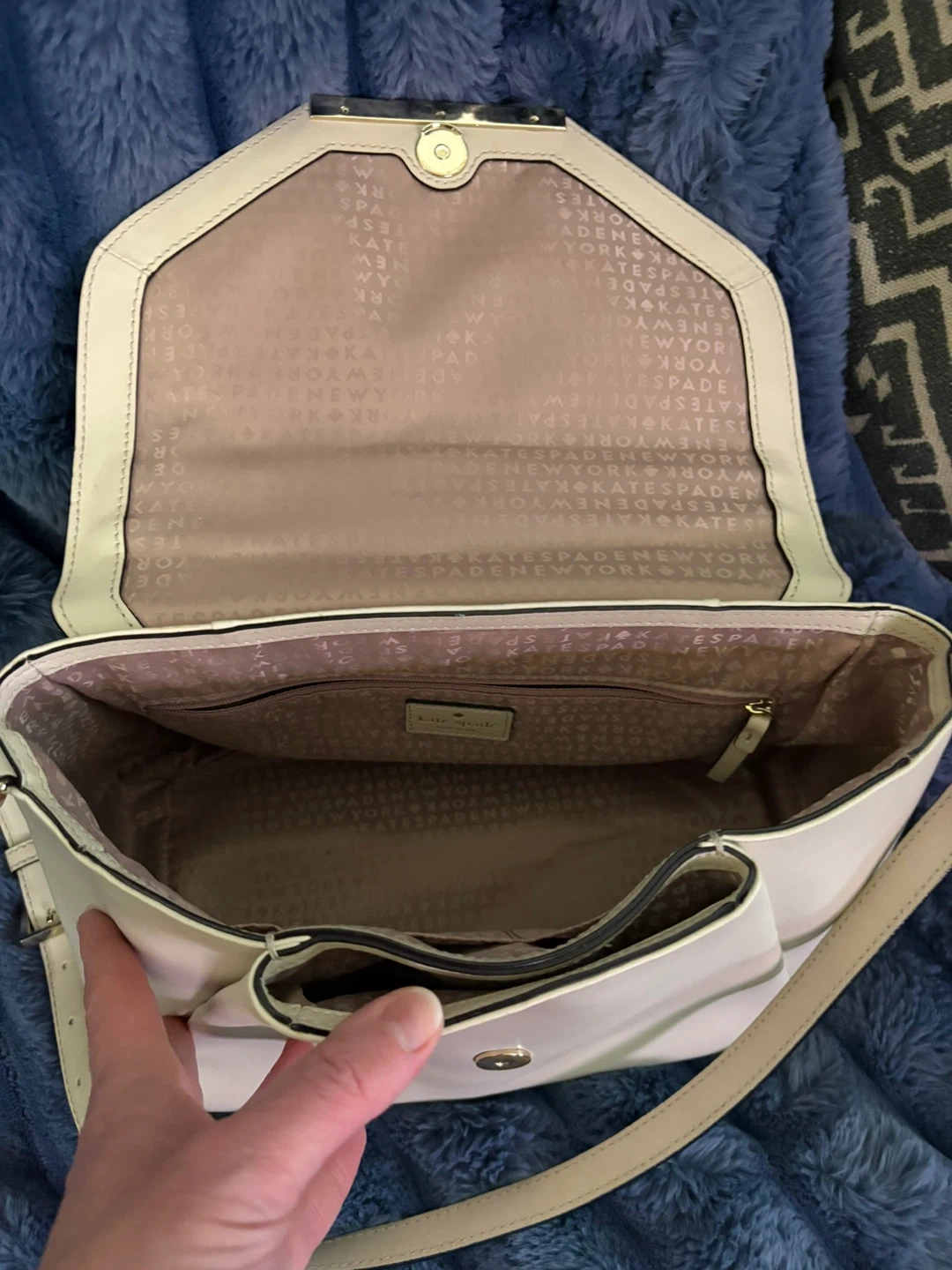 This is a cream leather satchel handbag from Kate Spade. It has a structured design with gold-tone hardware and a removable crossbody strap. The interior features multiple pockets for organization.