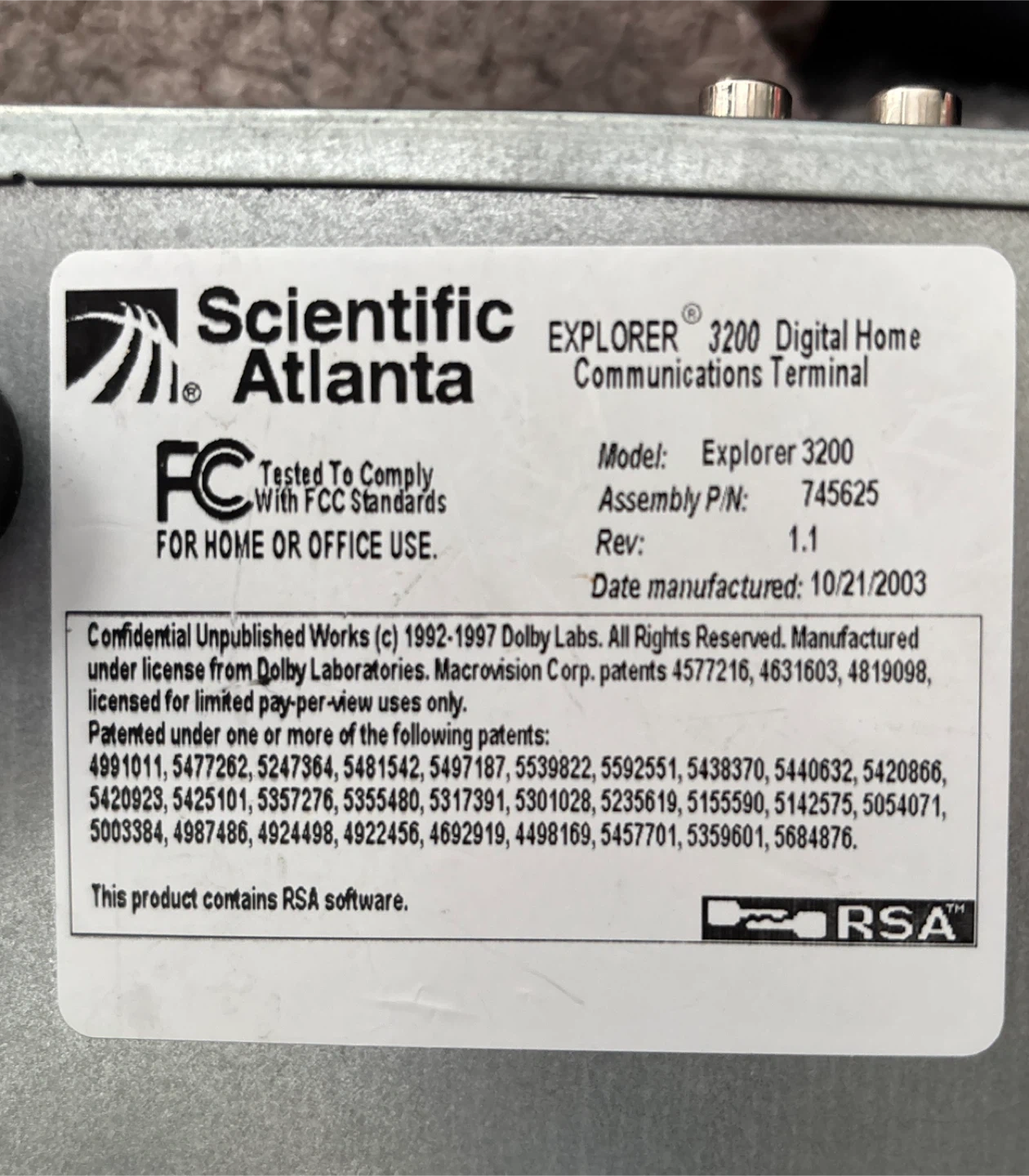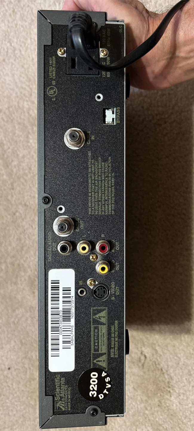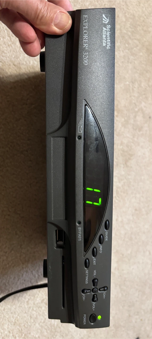 This is a Scientific Atlanta EXPLORER 3200 Digital Home Communications Terminal. It was manufactured on 10/21/2003. It supports various cable and audio/video outputs. Sold as-is in Brampton near Fletchers Parkette.